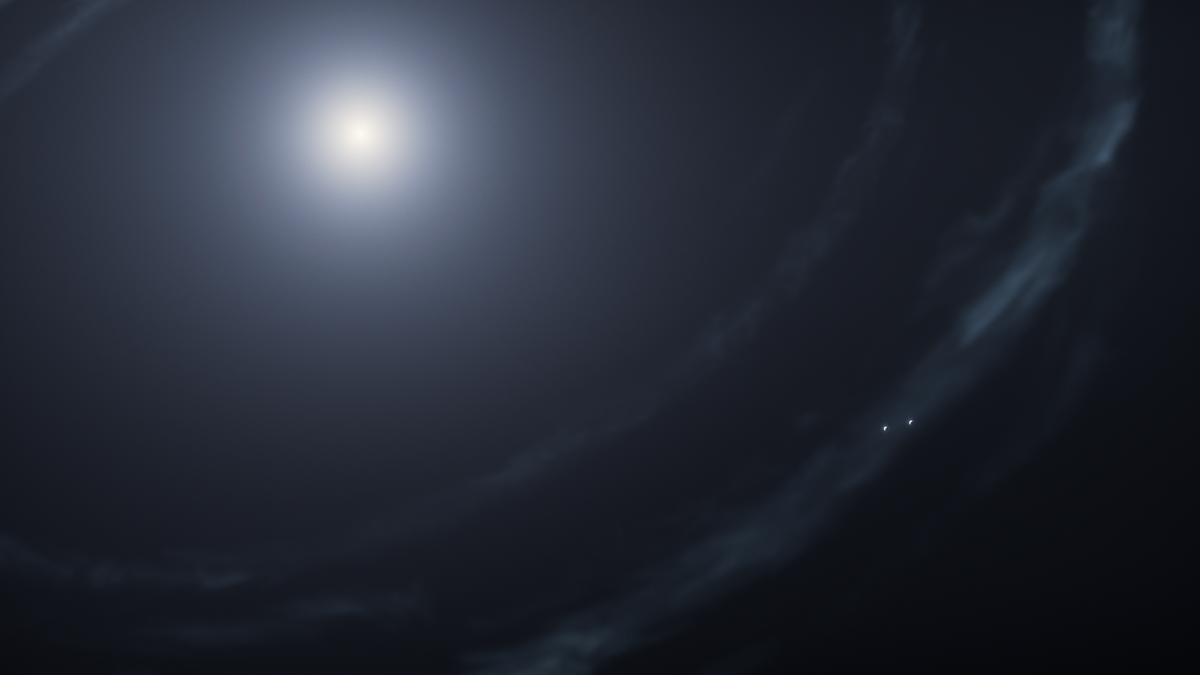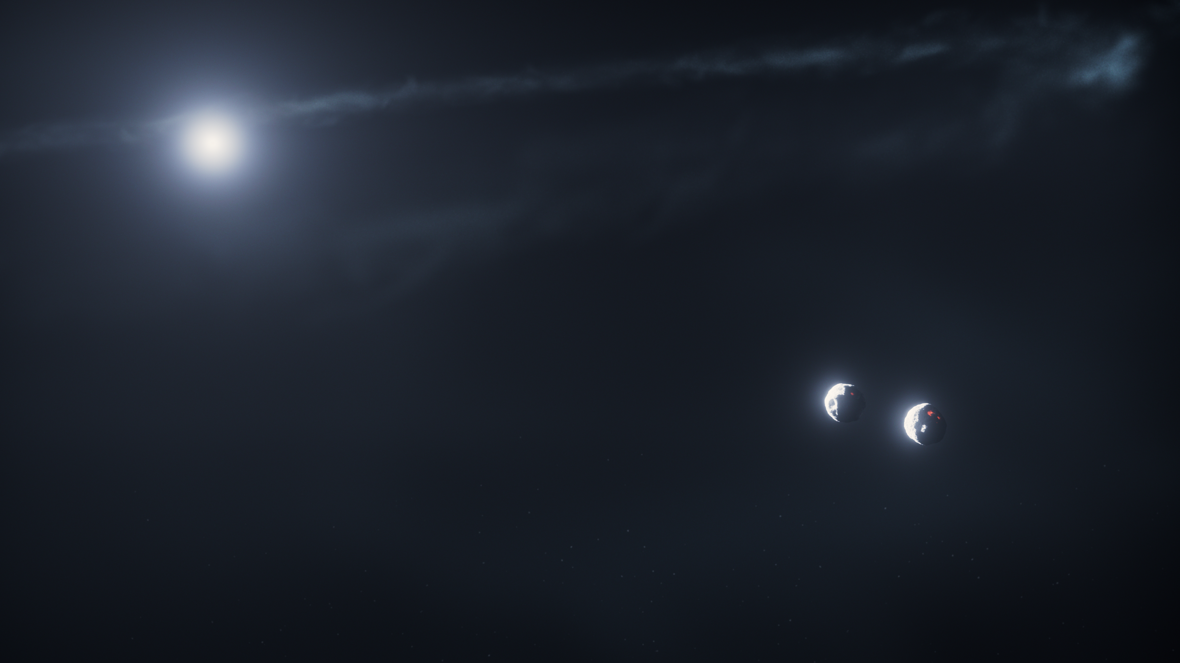 The top right panel is labeled 2 in its bottom right corner. At the top left of this panel is a white star with a diffuse and ghostly white halo against a black background. A faint, streaky, white, elliptical ring surround the star. The ring is viewed nearly edge on. In the bottom right quarter of the panel are two moonlike bodies in very close proximity to one another. These bodies are partially illuminated by the star, much like the Earth’s Moon in its last quarter.