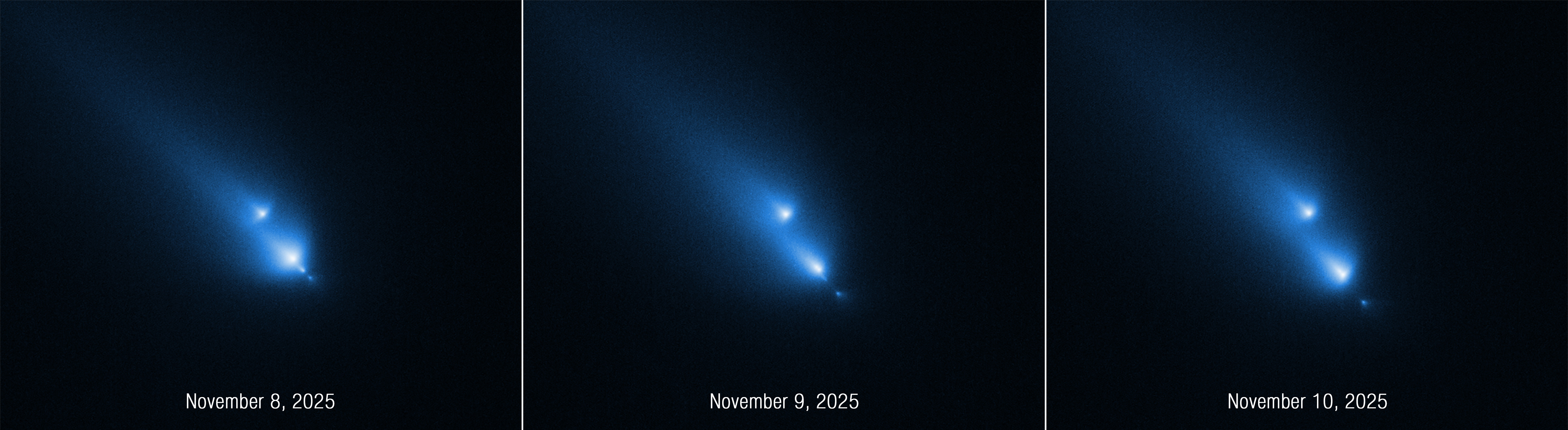 This series of images from NASA’s Hubble Space Telescope of the fragmenting comet C/2025 K1 (ATLAS), or K1 for short, was taken over the course of three consecutive days: Nov. 8, 9, and 10, 2025. Captured by Hubble’s STIS (Space Telescope Imaging Spectrograph) instrument, the sequence shows the progressive disintegration of the comet over this brief period. This is the first time Hubble has witnessed a comet so early in the process of breaking up.