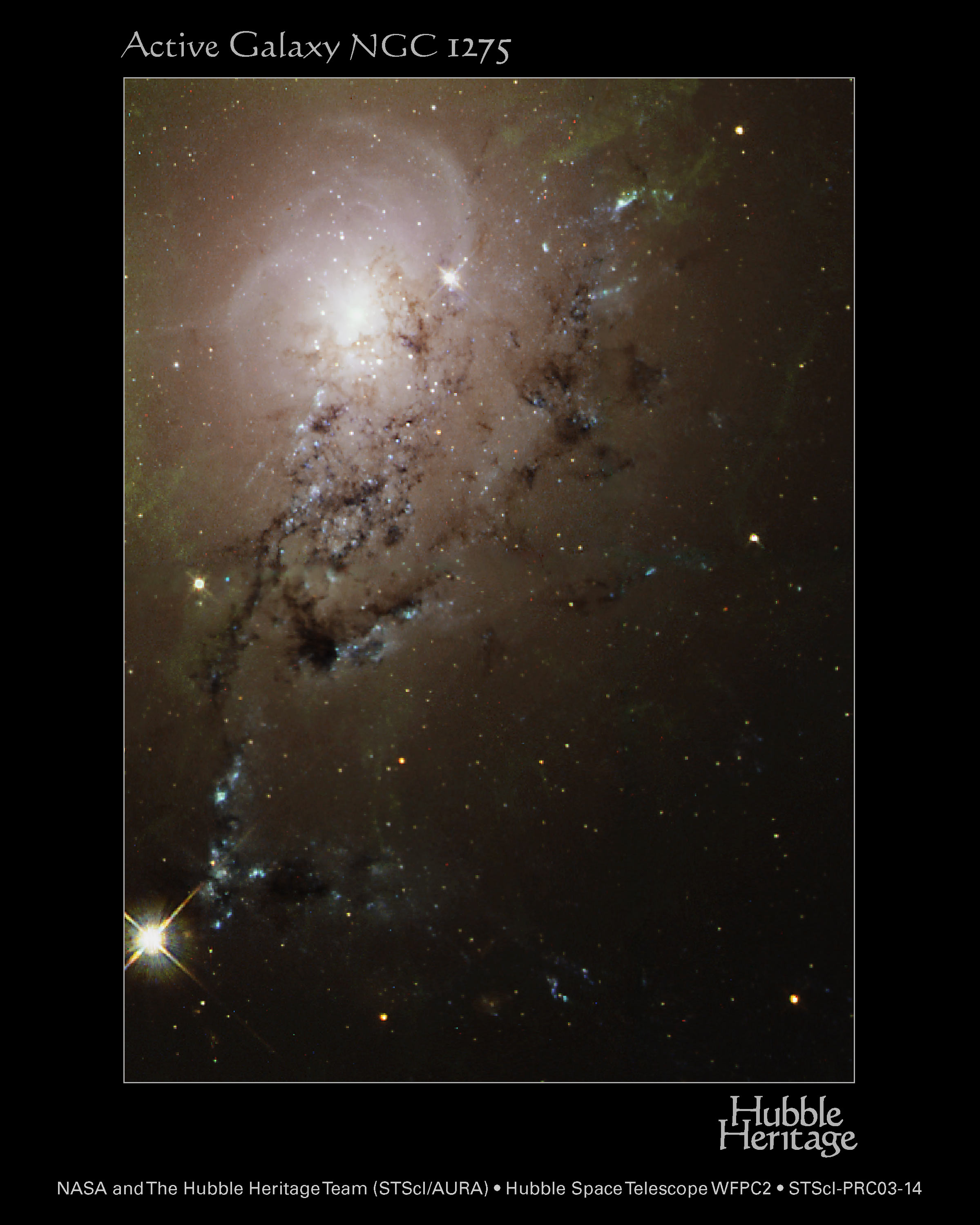 These images, taken with Hubble's Wide Field Planetary Camera 2 (WFPC2), show traces of spiral structure accompanied by dramatic dust lanes and bright blue regions that mark areas of active star formation. Detailed observations of NGC 1275 indicate that the dusty material belongs to a spiral system seen nearly edge-on in the foreground. The second galaxy, lying beyond the first, is actually a giant elliptical with peculiar faint spiral structure in its nucleus. These galaxies are believed to be colliding at over 6 million miles per hour.