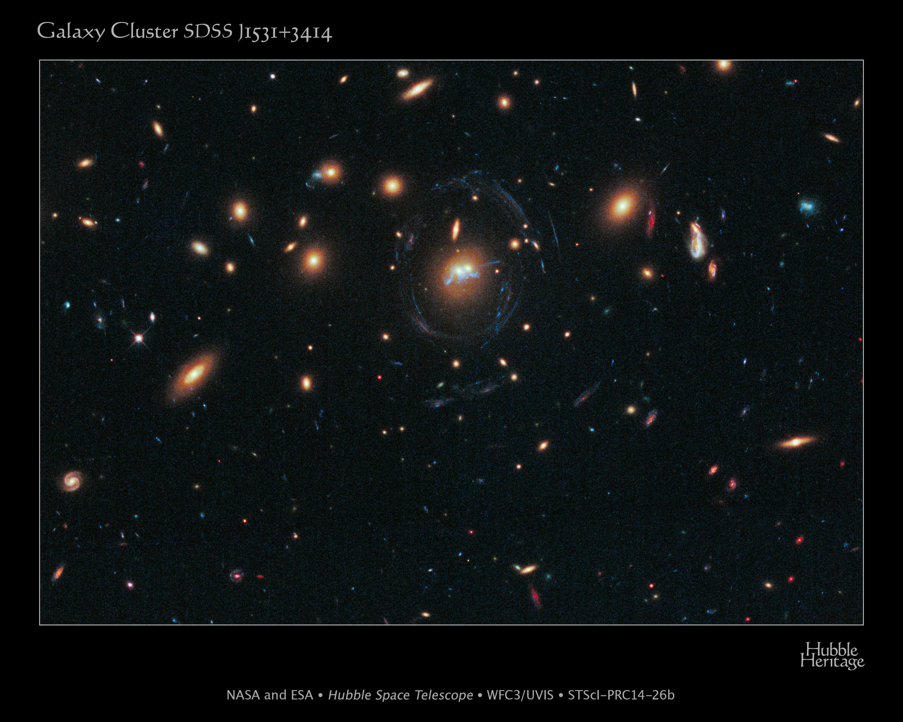 The cluster was first cataloged in the Sloan Digital Sky Survey, hence the name, SDSS J1531+3414. The sharp view of Hubble was used to image the cluster in May of 2013. The Wide Field Camera 3 instrument imaged the cluster in visible and infrared filters.