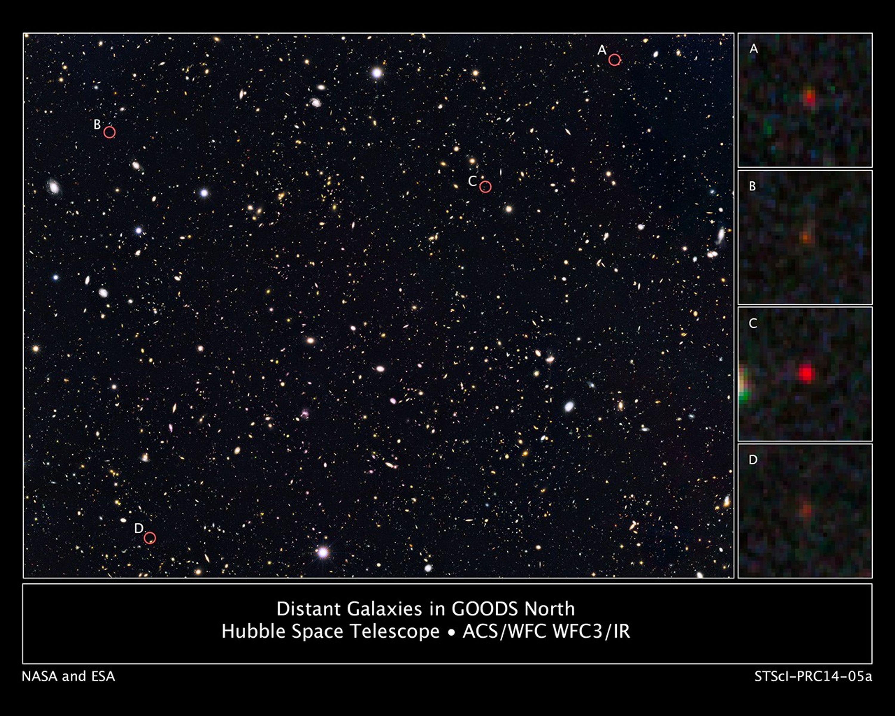 This is a portion of a deep-sky Hubble Space Telescope survey called GOODS North (Great Observatories Origins Deep Survey). The view is a composite of images taken in visible and near-infrared light. Researchers have circled four unusually red objects that appear as they existed...