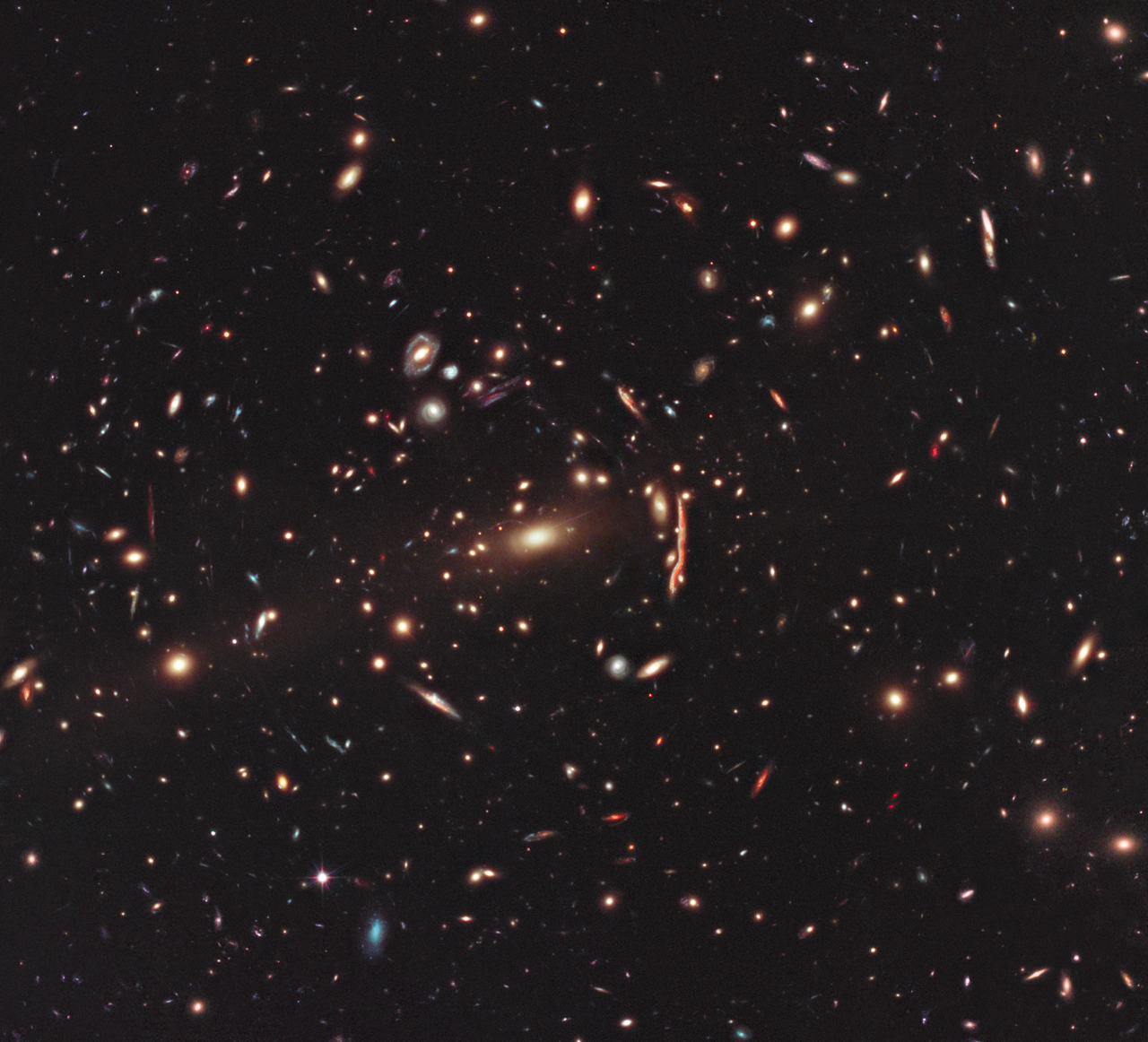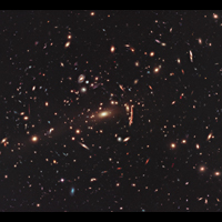 Four and a half billion light-years away in the constellation Virgo, scores of galaxies have been drawn together by the mutual gravitational pull. NASA's Hubble Space Telescope has peered at this galaxy cluster and gravitational lens, known as MACS 1206. Gravity from the cluster's immense mass bends the space around it, causing the images of more distant galaxies directly behind the cluster (that are within our line of sight) to be warped and cast into arc-like smears of light. The orange streak to the right of the image center is one such example of an optically distorted galaxy that resides millions of light-years behind MACS 1206. The circular pattern of smaller galaxy pieces is more evidence of gravitational lensing.