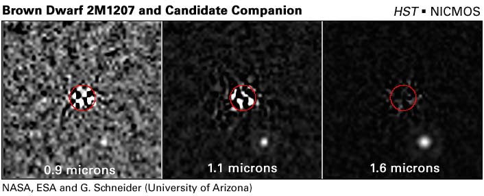 These are Hubble Near Infrared Camera and Multi-Object Spectrometer (NICMOS) Camera 1 images of 2M1207's giant planetary companion candidate at three increasingly longer near-infrared wavelengths [left to right: 0.9, 1.1, and 1.6 microns]. The light from 2M1207 itself has been greatly reduced by subtracting a second image of the star taken with Hubble rolled to a different orientation in the sky. Imperfections in the "differential roll" subtraction technique give rise to optical artifacts at the location of 2M1207, which is centered in the red circle of 0.2 arc second radius. The giant planetary companion candidate is the white disk located outside and to the lower right of the red circle. 2M1207, a young brown dwarf of spectral type M8.5, is itself quite red - 11 times fainter at 0.9 microns than it is at 1.6 microns. The giant planetary companion candidate at 0.9 microns is significantly redder in comparison, 44 times fainter at 0.9 microns than it is at 1.6 microns where, at that shorter wavelength, it is also 720 times fainter than 2M1207.