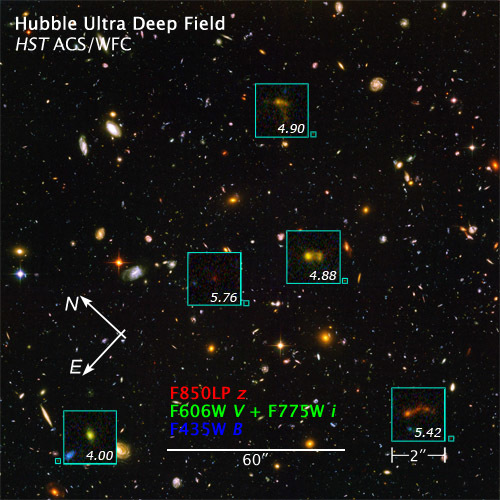 In this image of the Hubble Ultra Deep Field, several objects are identified as the faintest, most compact galaxies ever observed in the distant universe. They are so far away that we see them as they looked less than one billion years after the Big Bang. Blazing with the brilliance of millions of stars, each of the newly discovered galaxies is a hundred to a thousand times smaller than our Milky Way Galaxy.