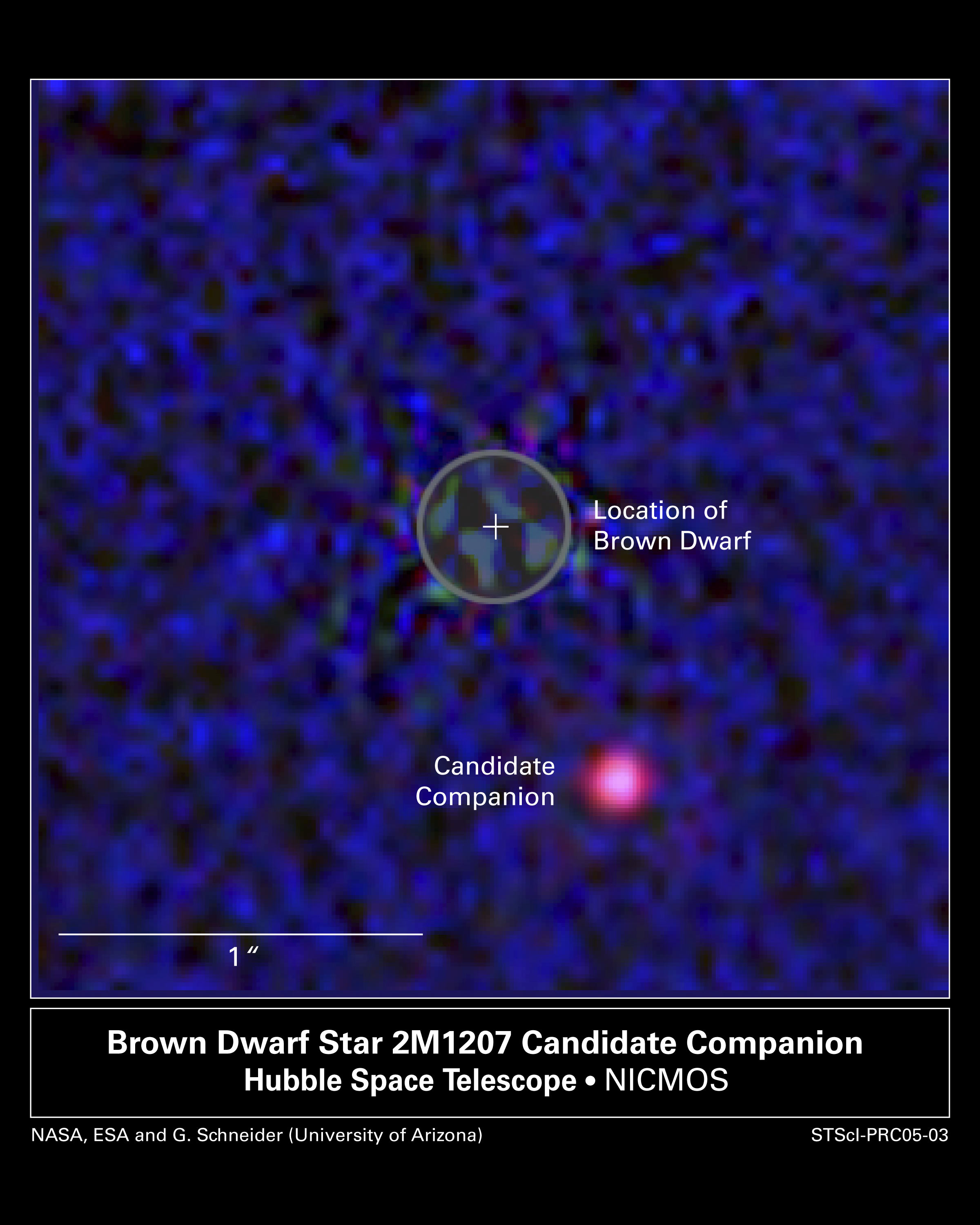 This is an artificial-color Hubble Near Infrared Camera and Multi-Object Spectrometer (NICMOS) infrared-light view of the brown dwarf star 2MASSWJ 1207334-393254 (aka 2M1207) and giant planet companion candidate. The possible companion, estimated to be about five times the mass of Jupiter, is the magenta colored spot at lower right. The brown dwarf's location is within the circle at image center. The glare of the dwarf, which is 700 times brighter than the planet candidate (as seen at Hubble's near-infrared sensitivity) has been greatly reduced through image processing of NICMOS pictures taken at different Hubble orientations. In this picture the dwarf and candidate planet are at a minimum distance of 5 billion miles apart. Further observations will be needed to confirm that the two objects are gravitationally bound. The red, green, and blue colors correspond to infrared wavelengths of (1.6, 1.1, and 0.9 microns respectively). At a temperature of only 1800 degrees Fahrenheit, the candidate companion object appears very red in the NICMOS images.