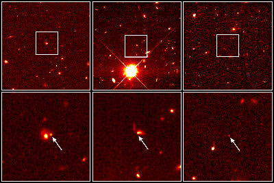 These Hubble Space Telescope images pinpoint three distant supernovae, which exploded and died billions of years ago. Scientists are using these faraway light sources to estimate if the universe was expanding at a faster rate long ago and is now slowing down.