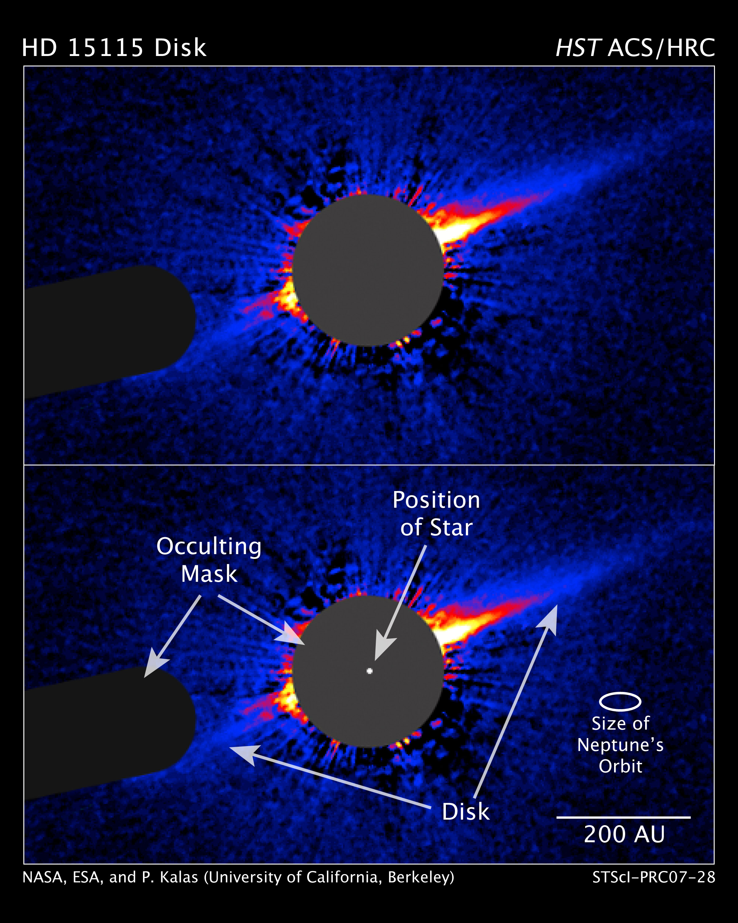 Astronomers used an occulting mask on Hubble's Advanced Camera for Surveys to block out the bright starlight so they could see the dim disk. The occulting masks can be seen in the image as the dark circle in the center and the dark bar on the left. The star is behind the central mask.