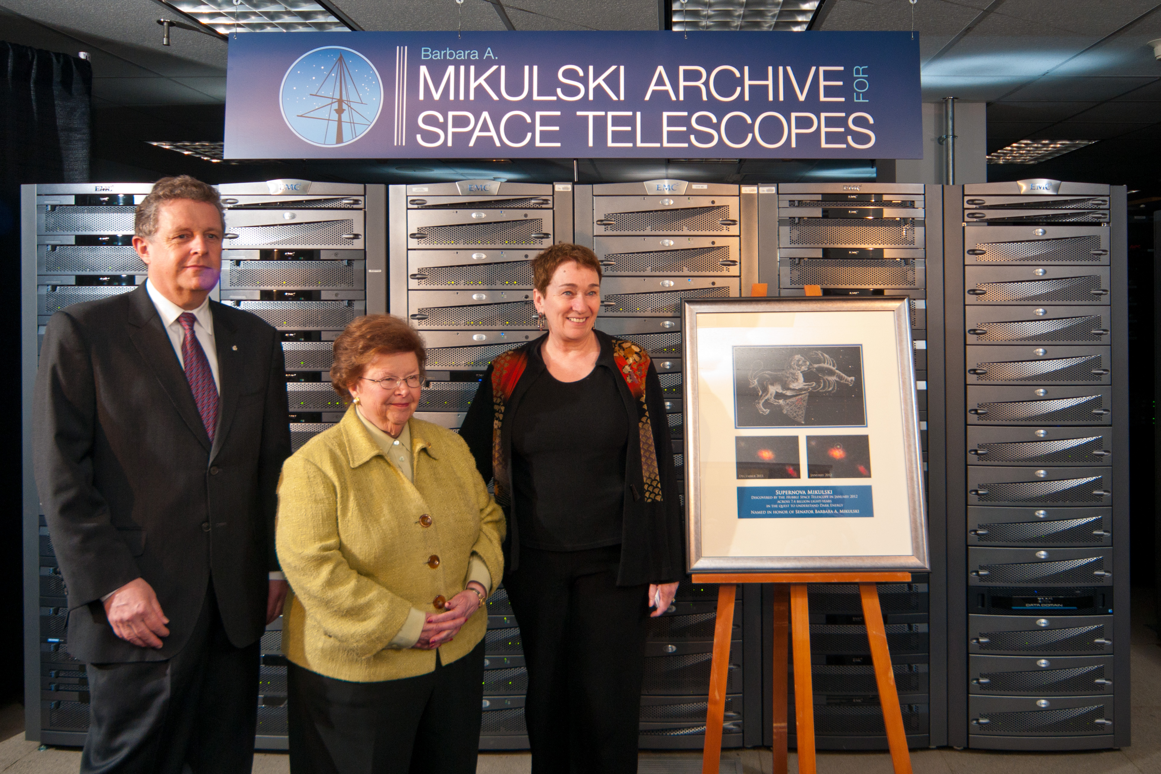 This is a view of the many computers that are part of the Barbara A. Mikulski Archive for Space Telescopes (MAST), located at the Space Telescope Science Institute in Baltimore, Md. The archive is named in honor of the United States Senator from Maryland for her career-long achievements and for becoming the longest-serving woman in U.S. Congressional history. MAST is NASA's repository for all of its optical and ultraviolet-light observations, some of which date to the early 1970s. The archive holds data from 16 NASA telescopes, including current missions such as the Hubble Space Telescope. Senator Mikulski is at picture center, STScI Director Matt Mountain at her right, and STScI Deputy Director Kathryn Flanagan at her left. The plaque is a photo of Supernova Milkuski, an exploding star that the Hubble Space Telescope spotted on Jan. 25, 2012. It was named in honor of the Senator by Nobel Laureate Adam Riess and the supernova search team with which he is currently working.