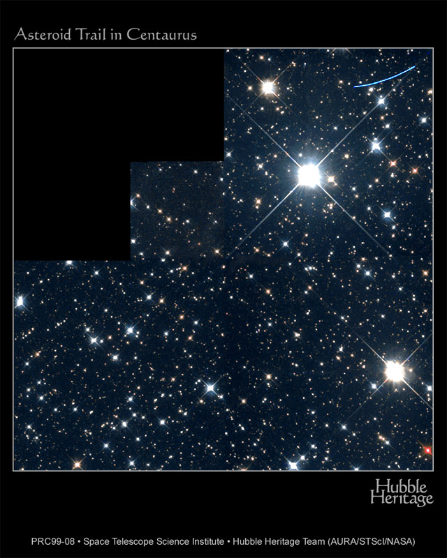 Most of the stars in this image lie near the center of our galaxy some 25,000 light-years distant. But one object, the blue curved streak, is something much closer. An uncatalogued, mile-wide bit of rocky debris orbiting the Sun only light-minutes away strayed into WFPC2's field while the image was being exposed. This and about a hundred other interlopers have been found by Jet Propulsion Laboratory astronomers Dr. Robin Evans, Dr. Karl Stapelfeldt, and collaborators, who have systematically searched the HST archive for these nearby objects. Their analysis indicates this asteroid's orbit could cross Mars' path. Seen briefly by HST, these asteroids are too small and faint to track from the ground long enough for precise orbits to be determined. They are destined to return to their unseen wanderings for hundreds or thousands of years until once again, by chance, they may flicker across the view of some watchful eye peering off into the depths of space.