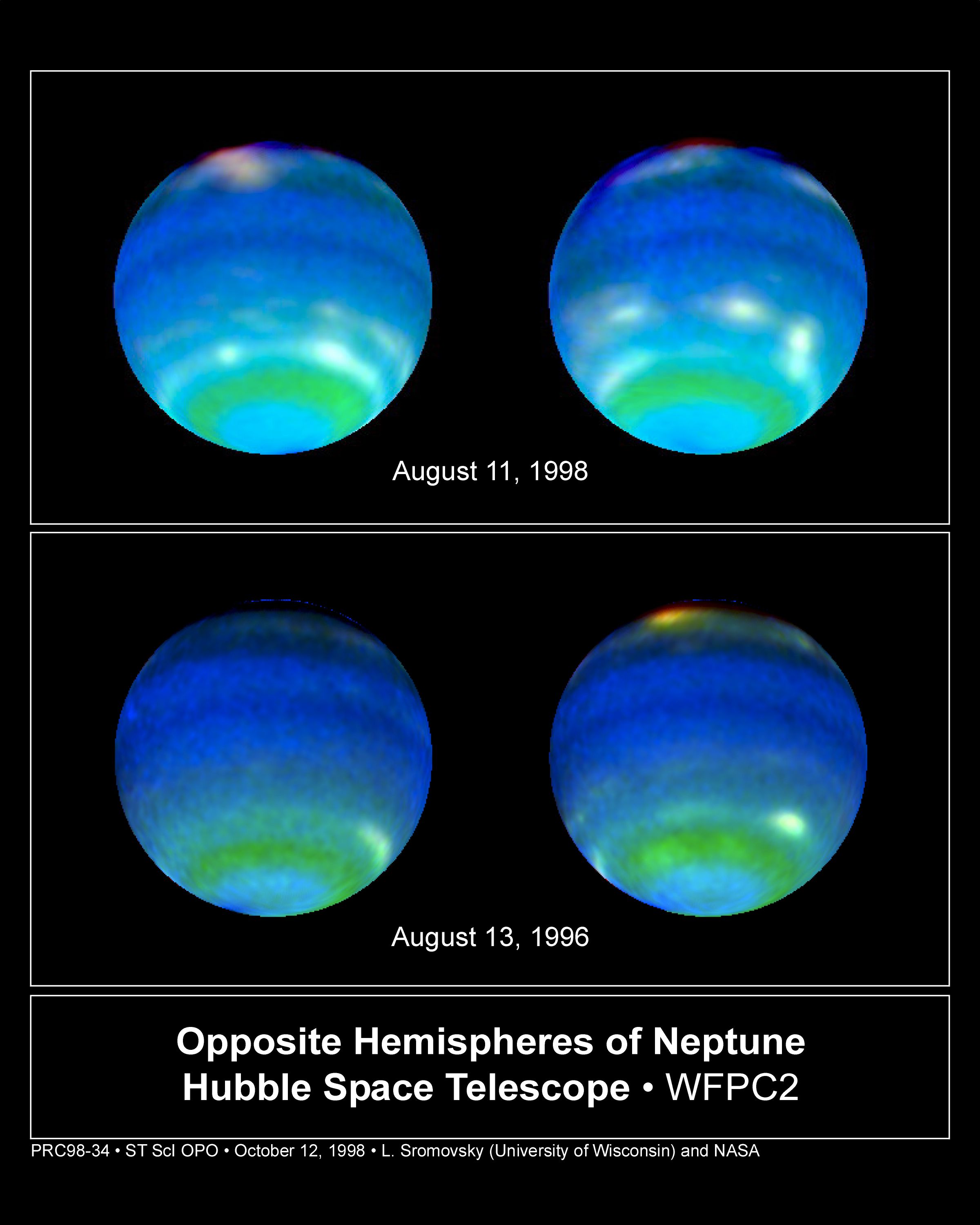 These views of Neptune, as seen through the Hubble Space Telescope, are helping planetary scientists gain some insight into the weird and wild weather that is a hallmark of the eighth planet from the sun. On Neptune, winds blow at 900 miles per hour and huge storms – some the size of Earth itself – come and go with regularity. How, precisely, Neptune's weather is driven is a mystery since the sun, which drives the Earth's weather, is 900 times dimmer there than on Earth. The bottom images show Neptune's Hubble portrait circa 1996. The top images were taken this year and help illustrate the dynamic weather features that dominate the planet.
