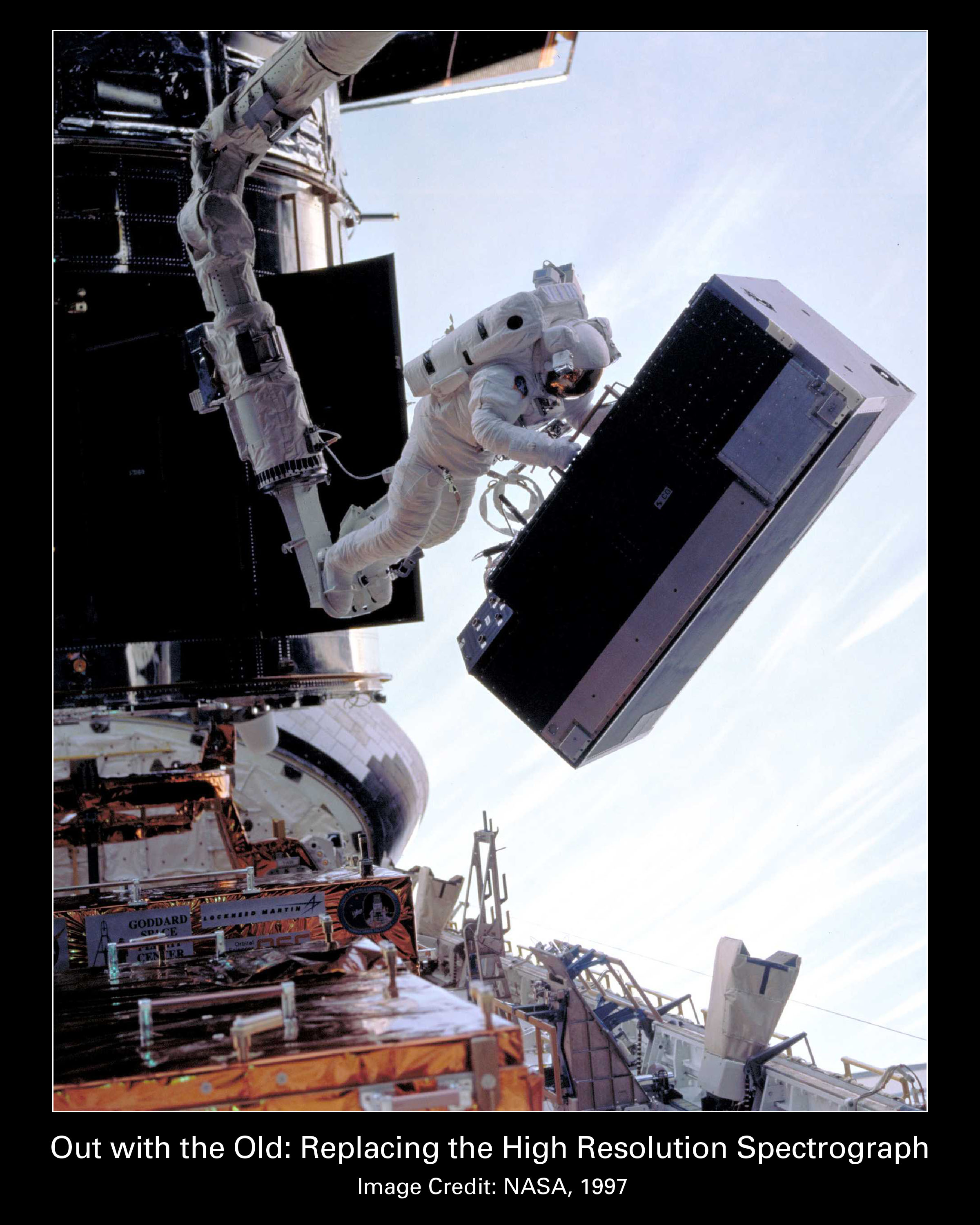 An astronaut removes the High Resolution Spectrograph in preparation for a new instrument during the second servicing mission in 1997. Hubble’s science instruments are large and complex. The telescope can hold four telephone-booth sized instruments and four piano-sized instruments.