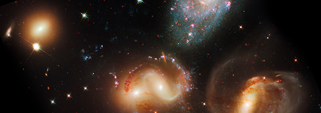 The four allied galaxies are involved in a gravitational relationship that's transforming some of their shapes and sparking new waves of star birth both inside and outside of the galaxies. In the twisted galaxy at top right, called NGC 7319, each blue fleck in the upper spiral arm and red blotch to the right of the galaxy's core is a cluster of many thousands of stars. Near the center of the image, two galaxies, NGC 7318A and NGC 7318B, are so close together they at first seem to be one. Wrapped around the pair are sparkling garlands of bright blue star clusters and pinkish gas clouds where new stars and star clusters are developing. The smooth, sedate galaxy in the lower left, NGC 7317, seems strangely unaffected by the gravitational commotion happening nearby but claims some orange-colored star clusters of its own.
