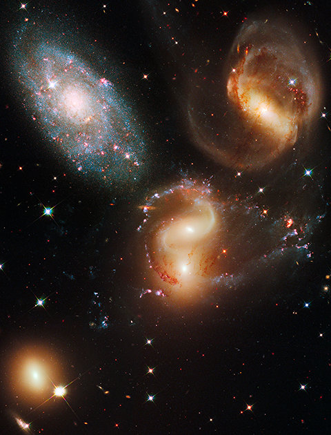 In 1877, French astronomer Édouard Stephan turned a telescope to a spot in the constellation Pegasus and discovered this cozy collection of five large galaxies. Stephan's Quintet, as the group is now known, includes four distant galaxies that are connected to each other through gravity and one galaxy that is much closer to us but just happens to lie in the same direction in the sky. The imposter is easy to pick out in this Hubble image, because it looks different than the other galaxies. The bluer galaxy, called NGC 7320, is only about 40 million light-years from Earth, while the other, redder galaxies are about 290 million light-years away.