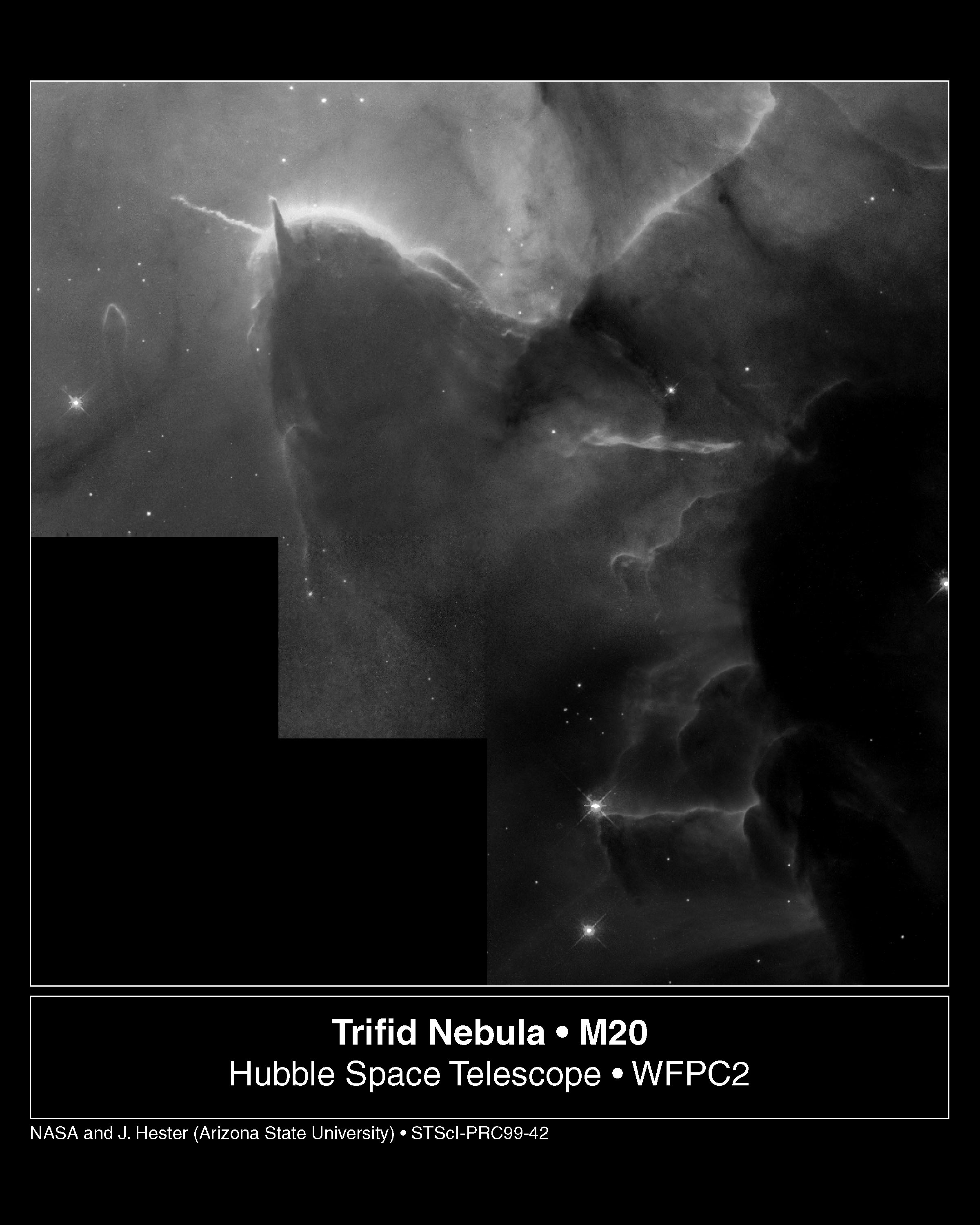 This NASA Hubble Space Telescope image of the Trifid Nebula reveals a stellar nursery being torn apart by radiation from a nearby, massive star. The picture also provides a peek at embryonic stars forming within an ill-fated cloud of dust and gas, which is destined to be eaten away by the glare from the massive neighbor. This stellar activity is a beautiful example of how the life cycles of stars like our Sun is intimately connected with their more powerful siblings.