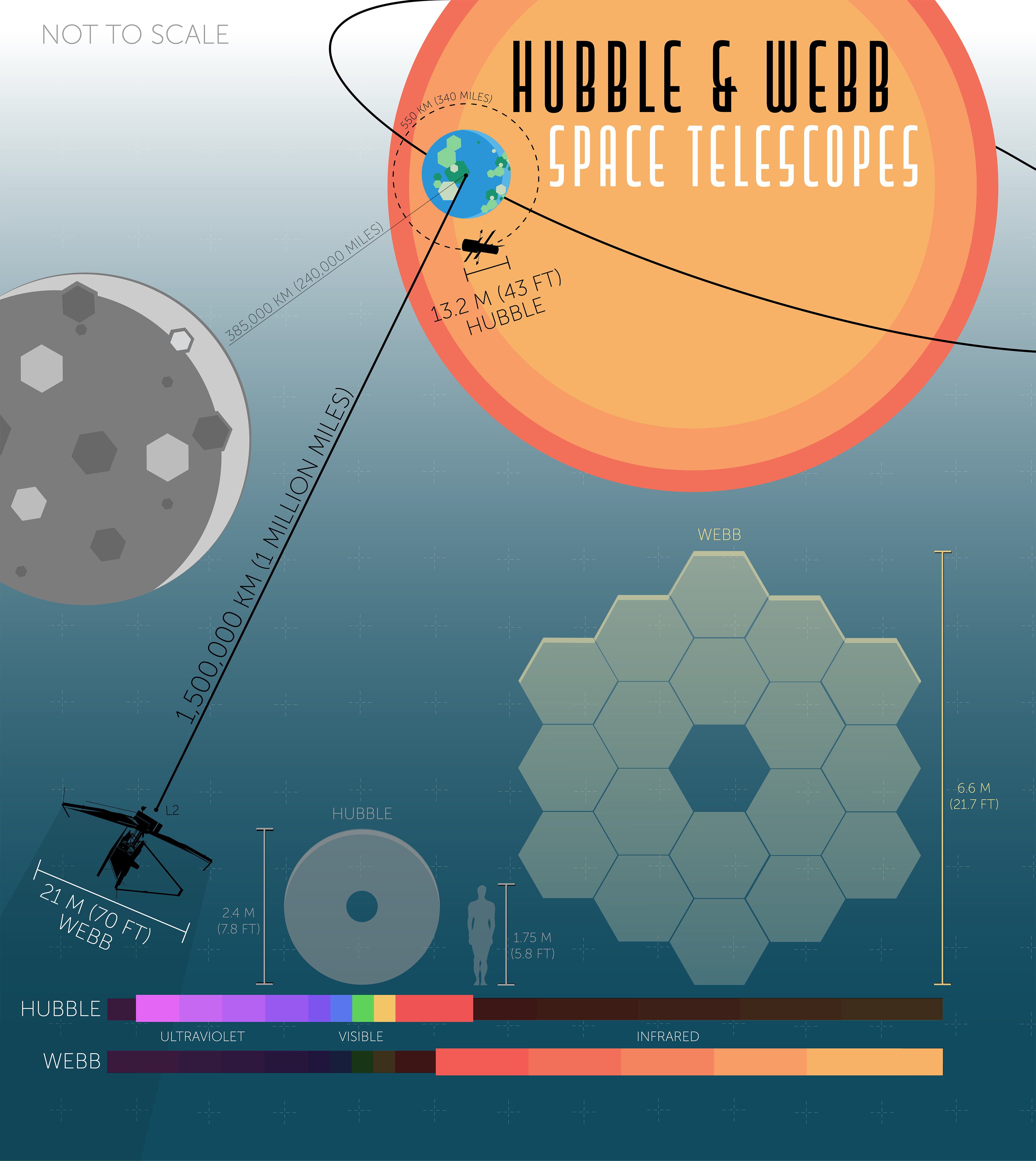 The Hubble and Webb Space Telescopes will be complementary observatories, and Webb will build upon many of Hubble’ amazing discoveries. The two spacecraft differ in their size, shape, orbital distance from the Earth, and wavelength coverage of light.