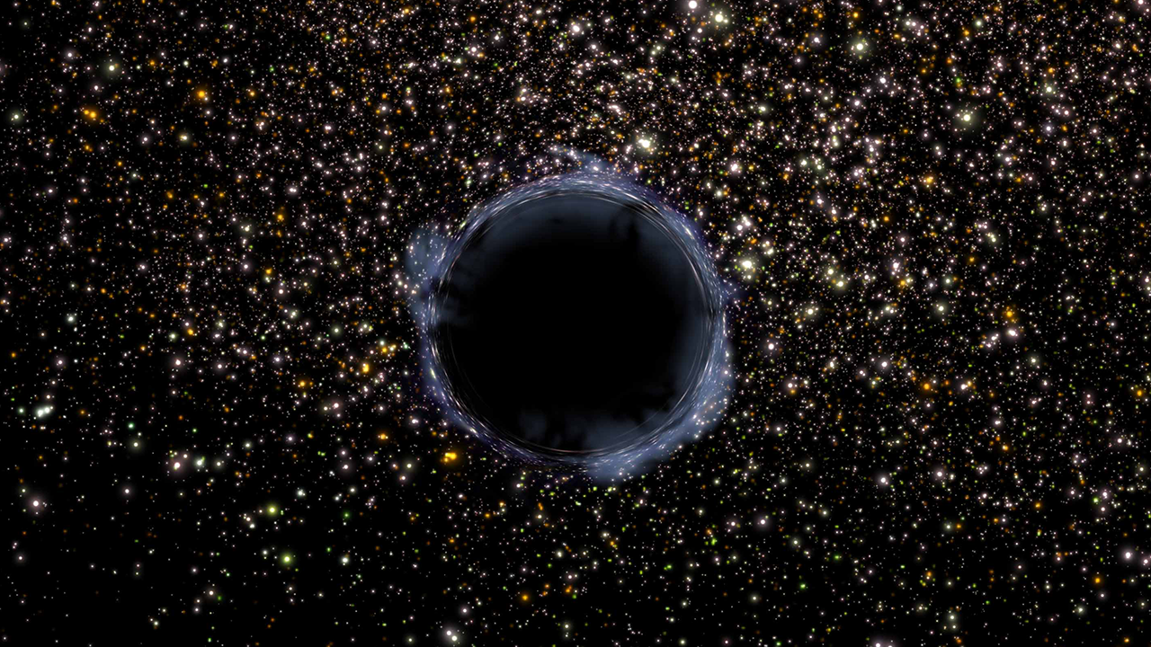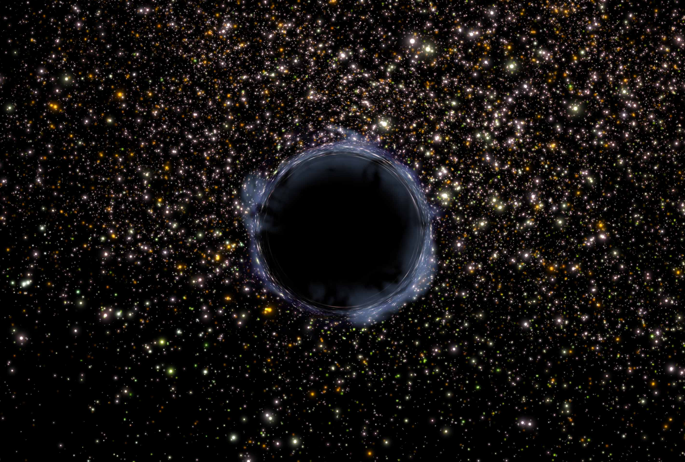 Artist's view of a black hole in a globular cluster. A black hole is an infinitely small and dense region where space is so tightly warped by gravity that not even light can escape.