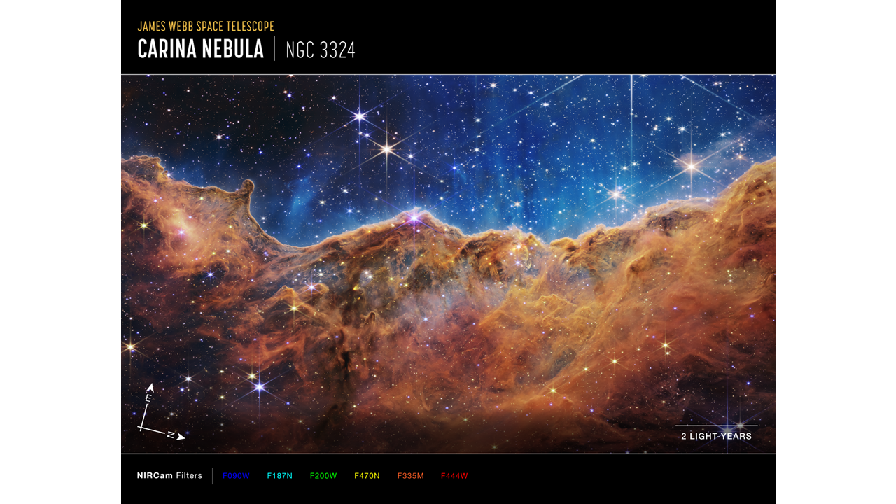 Image of the Carina Nebula (NGC 3324) captured by Webb’s Near-Infrared Camera (NIRCam), with compass arrows, scale bar, and color key for reference. The north and east compass arrows show the orientation of the image on the sky. Note that the relationship between north and east...