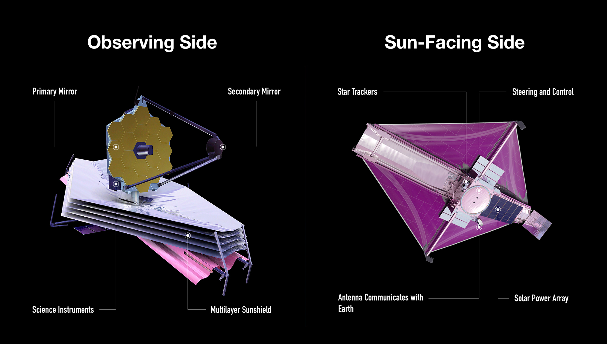 The lower part of Webb, where its five-layered sunshield is, faces the Sun. This is where its equipment that does not need to be cooled, like its solar panel, antennae, computer, gyroscopes, and navigational jets, are.
