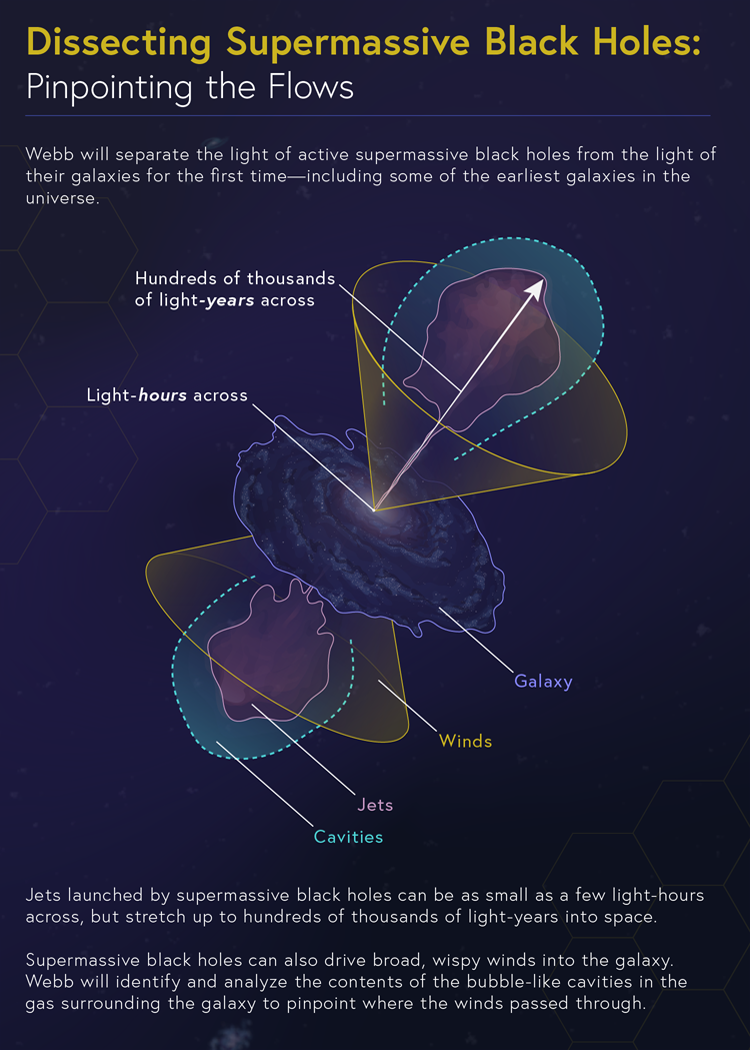 Both active supermassive black holes and their galaxies emit infrared light, but it’s not clear precisely how much each is sending out into space. To complicate matters, the supermassive black holes emit both bright bipolar jets and broad, wispy winds that carve cavities into the galaxies around them. NASA’s James Webb Space Telescope will be able to pinpoint the light’s sources to help researchers understand where the energy originates and disentangle the processes at work.