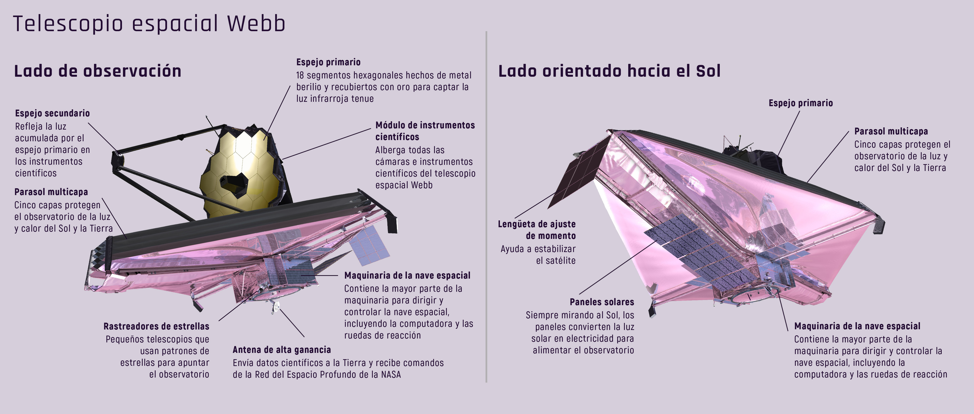 Un parasol del tamaño de una cancha de tenis protege el telescopio espacial Webb de fuentes externas de luz y calor para poder detectar las débiles señales de calor de objetos muy distantes. Este diagrama del telescopio espacial Webb ilustra tanto el lado de observación, como el lado orientado hacia el Sol.