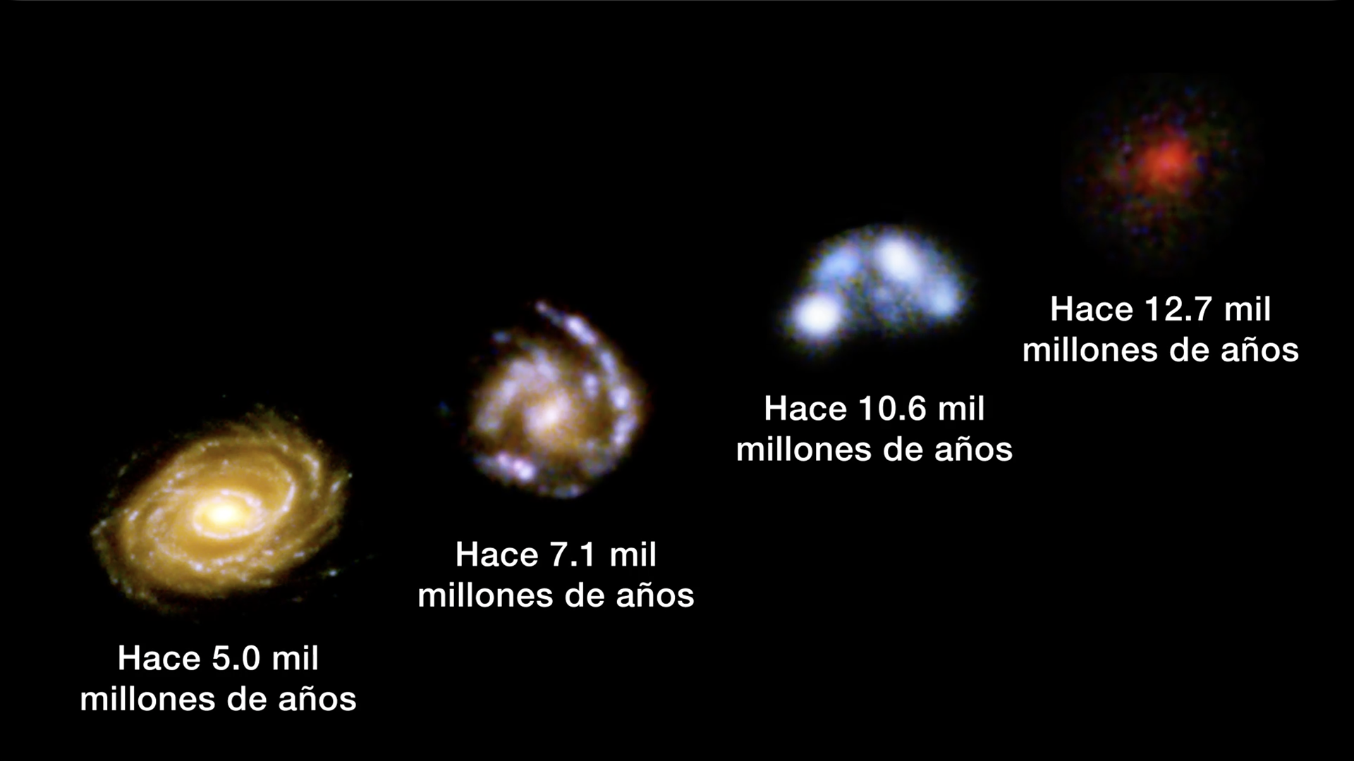 Cuando miramos hacia el espacio, también miramos hacia atrás en el tiempo. Las y los astrónomos pueden rastrear la evolución de las galaxias al observar galaxias a distancias muy lejanas para revelar como se veían las galaxias hace mucho tiempo. Este ejemplo, utiliza el campo ultra profundo del telescopio espacial Hubble y muestra los cambios en la apariencia de las galaxias a lo largo de miles de millones de años luz en el espacio y, por lo tanto, a través de miles de millones de años en el tiempo. El telescopio espacial Webb mejorará estas observaciones y las extenderá a las primeras galaxias en el universo.