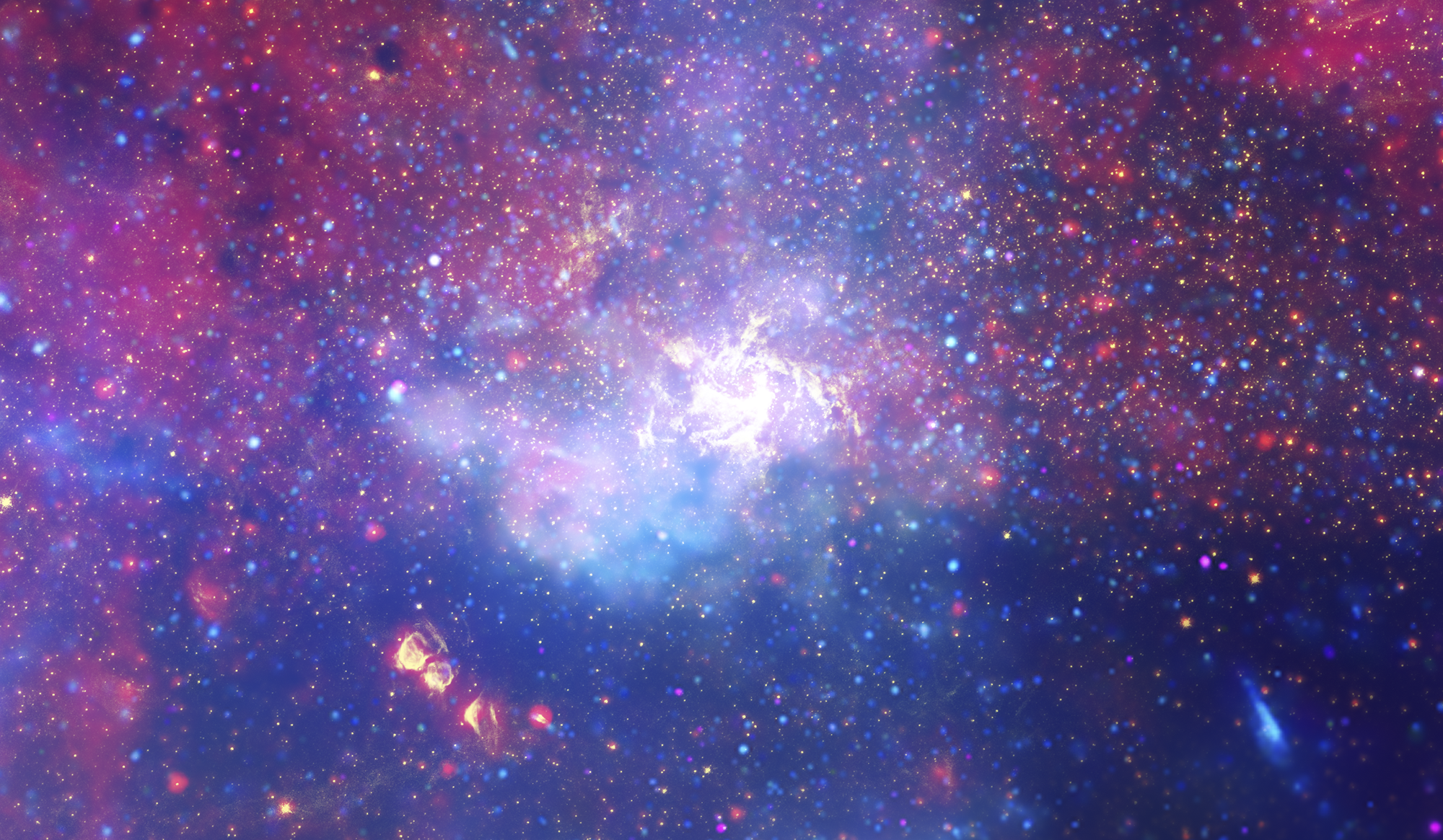 In the composite image shown here, colors represent different wavelengths of light. Hubble’s near-infrared observations are shown in yellow, revealing hundreds of thousands of stars, stellar nurseries, and heated gas. The deeper infrared observations of NASA’s Spitzer Space Telescope are shown in red, revealing even more stars and gas clouds. Light detected by NASA’s Chandra X-ray Observatory is shown in blue and violet, indicating where gas is heated to millions of degrees by stellar explosions and by outflows from the supermassive black hole.