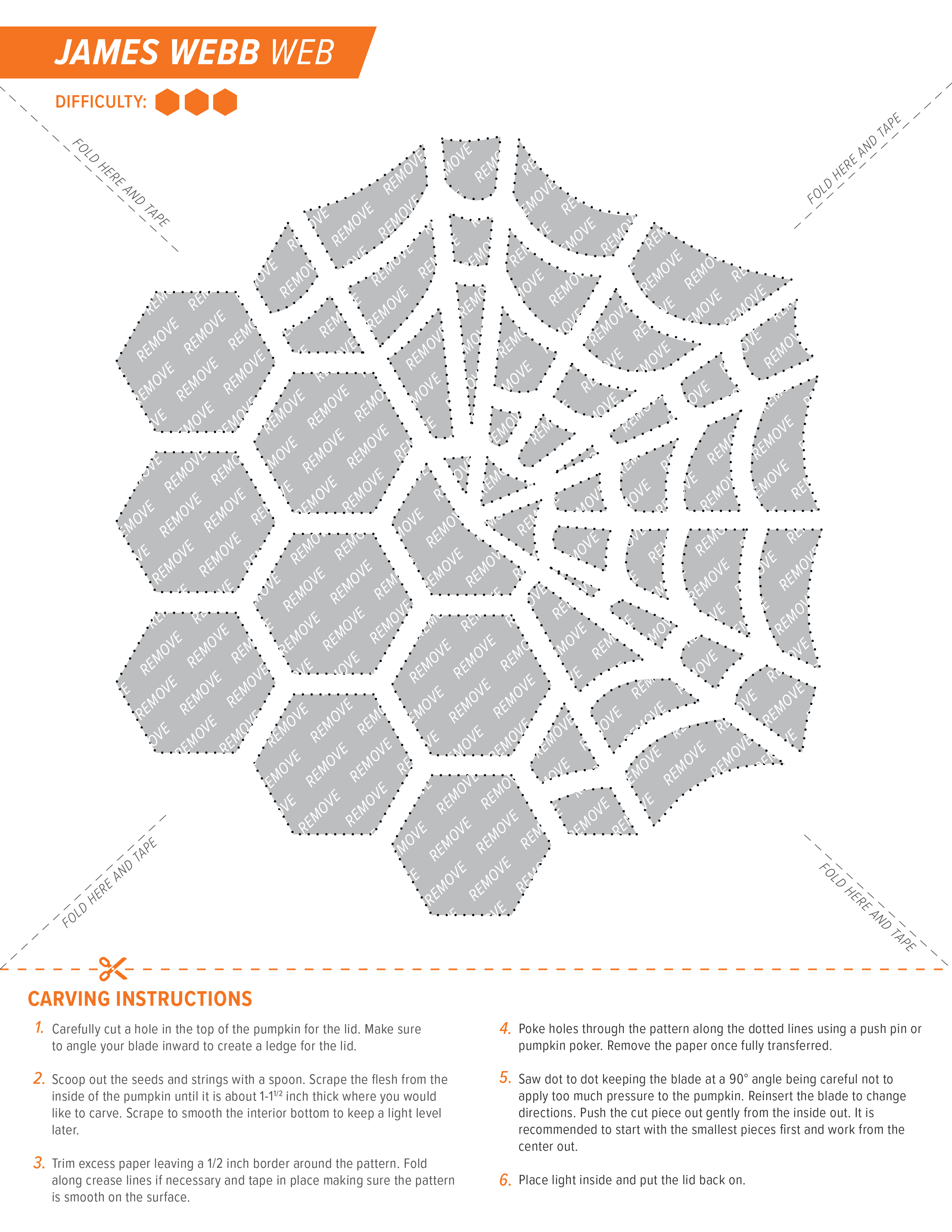 Shall we carve a web or a Webb? No need to choose with these special Halloween-edition stencils featuring the James Webb Space Telescope’s distinctive hexagonal mirror. While the real Webb mirror is busy capturing invisible infrared light from distant stars, planets, and galaxies, these Web(b) stencils will help illuminate your neighborhood with an eerie orange glow. Note: Spider, spiderweb, and mirror are not to scale.