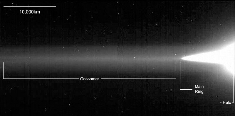 All three components of Jupiter’s ring system are captured in this image from NASA’s Galileo spacecraft: the flat main ring, the halo that is interior to the main ring, and the diffuse outer gossamer ring. The gossamer ring is shown stretching the width of this mosaic image (and continuing beyond), with the main ring and halo on the right-hand side. The image is purposely overexposed to accentuate the faint gossamer ring. The images were obtained when Galileo was in Jupiter’s shadow, peering back toward the Sun.
