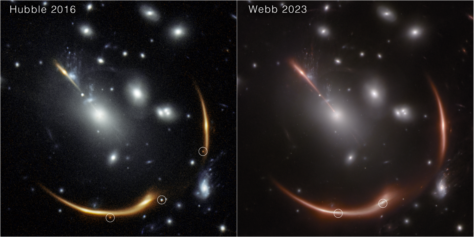 Left: In 2016 NASA’s Hubble Space Telescope spotted a multiply imaged supernova, nicknamed Supernova Requiem, in a distant galaxy lensed by the intervening galaxy cluster MACS J0138. Three images of the supernova are visible, and a fourth image is expected to arrive in 2035. In this near-infrared image, light at 1.05 microns is represented in blue and 1.60 microns is orange. Right: In November 2023 NASA’s James Webb Space Telescope identified a second multiply imaged supernova in the same galaxy using its NIRCam (Near-Infrared Camera) instrument. This is the first known system to produce more than one multiply-imaged supernova.