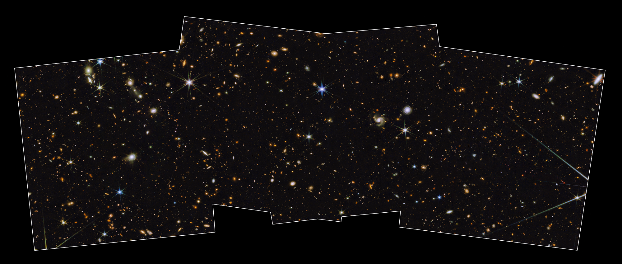 A swath of sky measuring 2% of the area covered by the full moon was imaged with Webb’s Near-Infrared Camera (NIRCam) in eight filters and with Hubble’s Advanced Camera for Surveys (ACS) and Wide-Field Camera 3 (WFC3) in three filters that together span the 0.25 – 5-micron wavelength range. This image represents a portion of the full PEARLS field, which will be about four times larger. Thousands of galaxies over an enormous range in distance and time are seen in exquisite detail, many for the first time. Light from the most distant galaxies has traveled almost 13.5 billion years to reach us. Because this image is a combination of multiple exposures, some stars show additional diffraction spikes. This representative-color image was created using Hubble filters F275W (purple), F435W (blue), and F606W (blue); and Webb filters F090W (cyan), F115W (green), F150W (green), F200W (green), F277W (yellow), F356W (yellow), F410M (orange), and F444W (red).