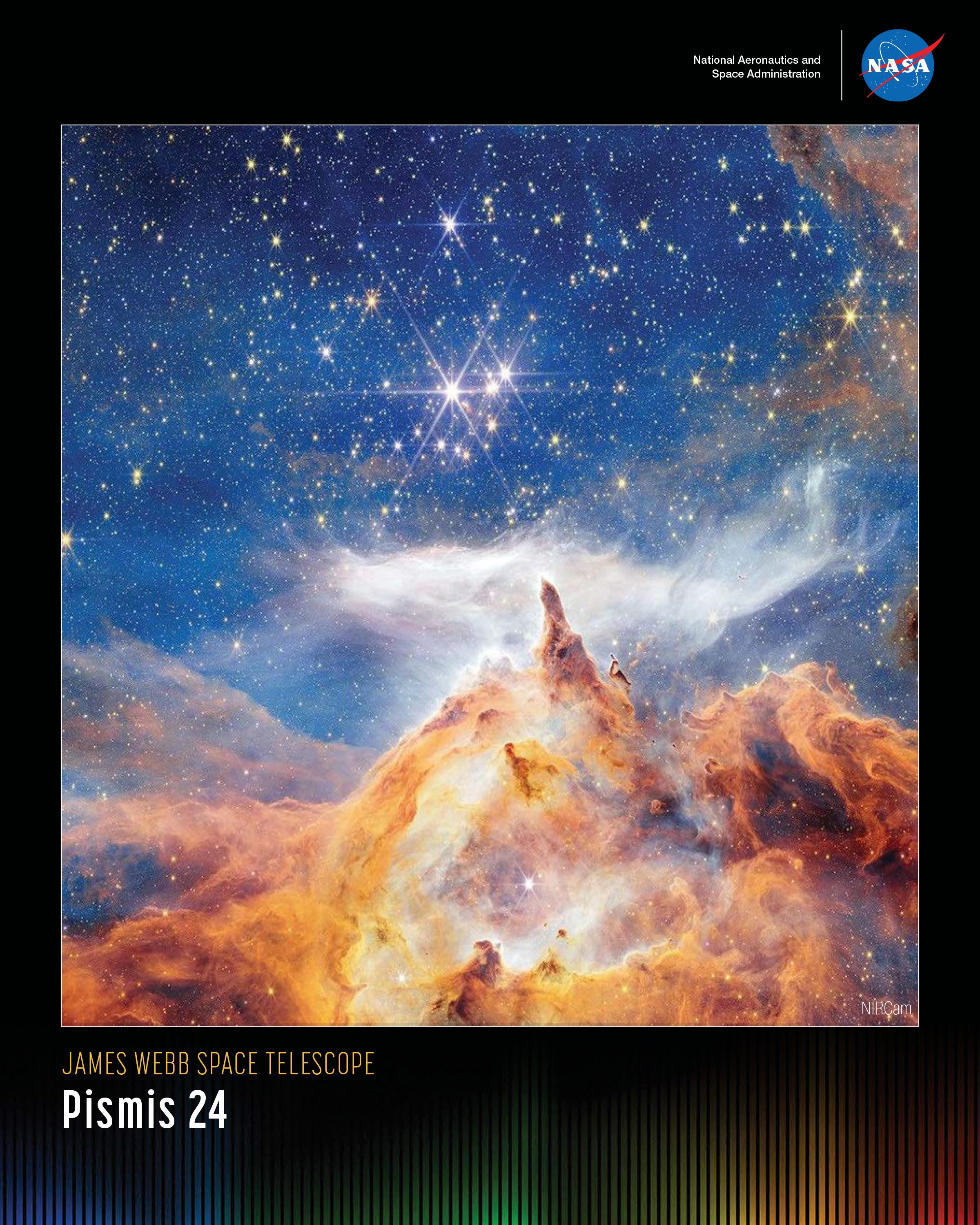 Descarga e imprime el mini póster que muestra una imagen de Pismis 24 capturada en 2025 por el telescopio espacial James Webb de la NASA. ¡Cuélgalo en tu casa, colegio, trabajo o vecindario!