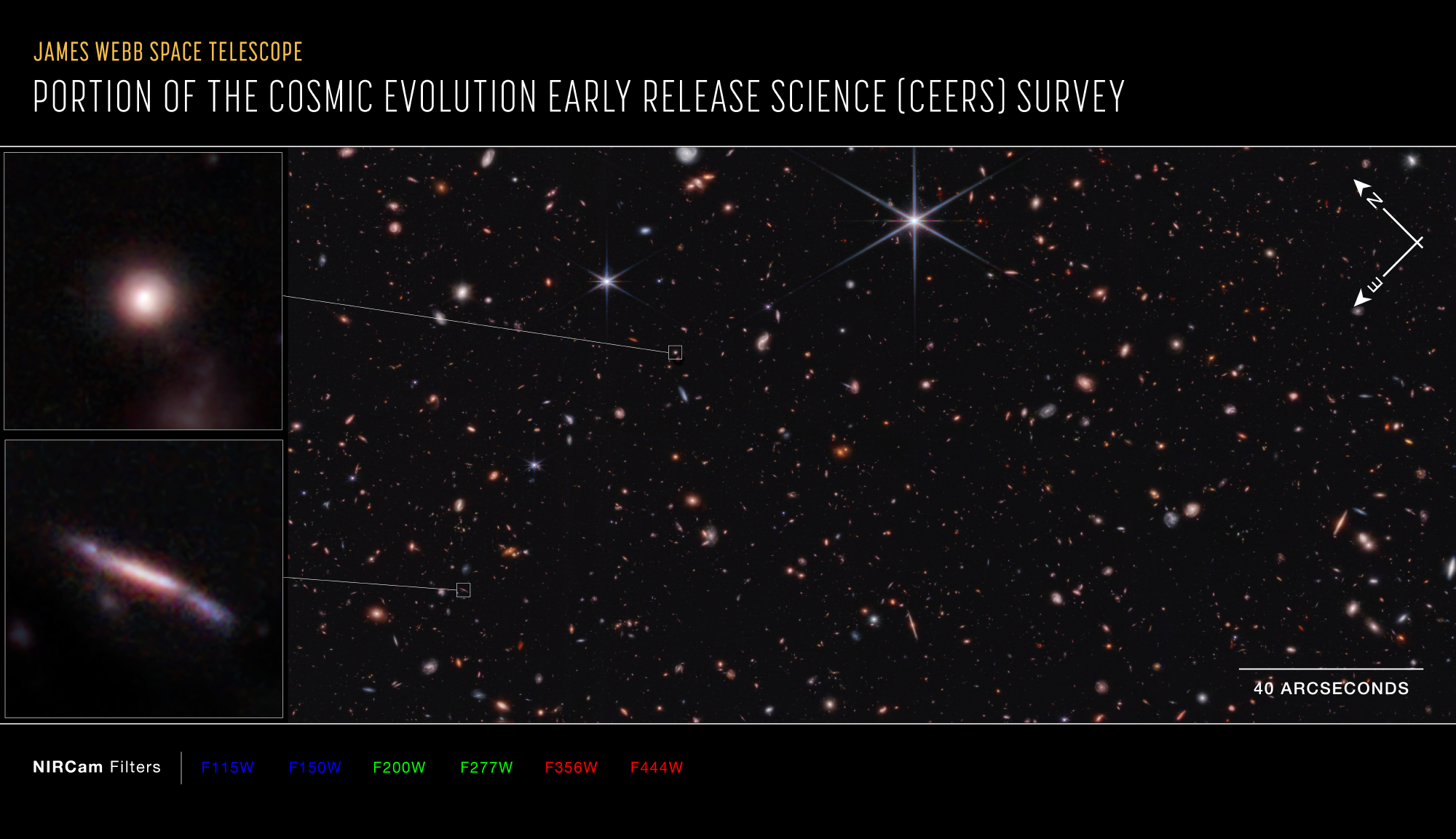 This is a portion of the Cosmic Evolution Early Release Science (CEERS) Survey, made up of several near-infrared pointings from NIRCam (the Near-Infrared Camera) aboard the James Webb Space Telescope. These observations are within the same region studied by the Hubble Space Telescope, which is known as the Extended Groth Strip.