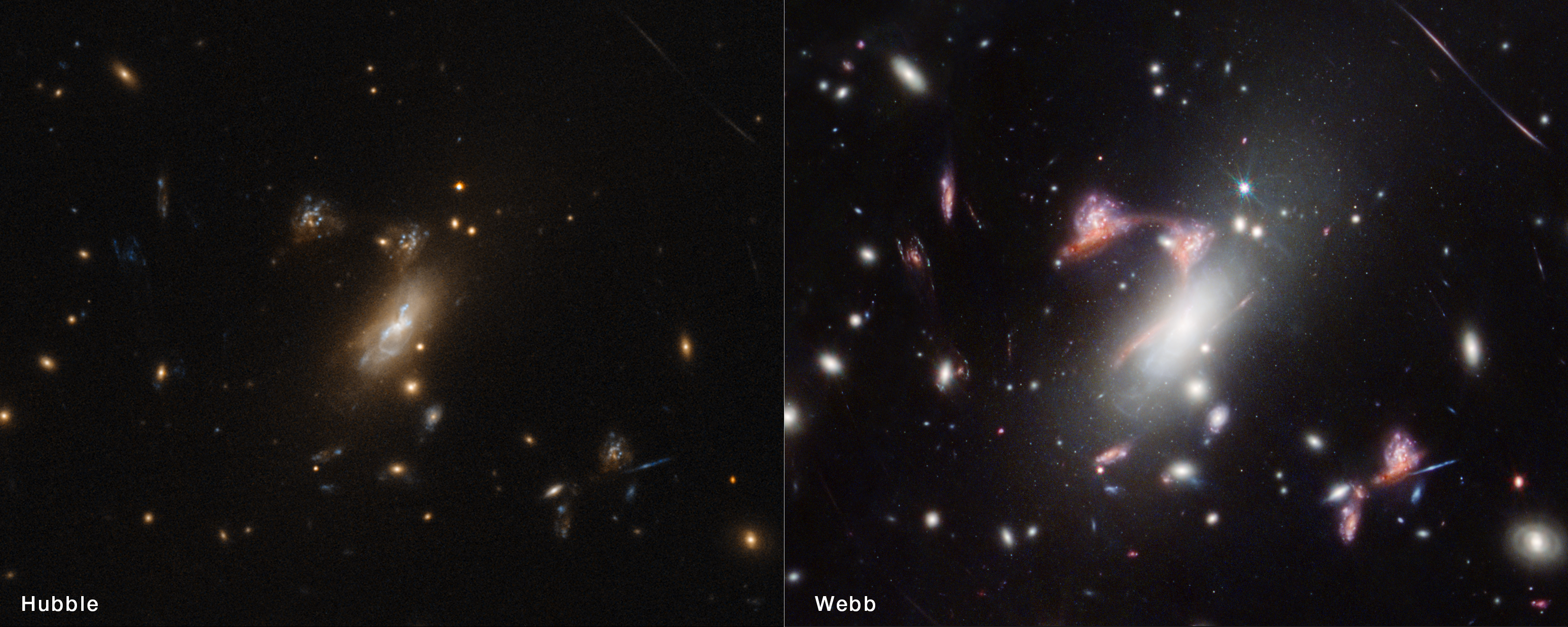 NASA’s Hubble Space Telescope has also observed the galaxy cluster MACS-J0417.5-1154, but the dusty red galaxy that appears multiple times to form a question mark shape is much more prominent in the Webb image. The infrared light that Webb detects is better able to pass through the cosmic dust of its home galaxy to reach the telescope. Astronomers used Hubble’s ultraviolet observations to help determine where star formation is happening in both the red galaxy and its close companion, a face-on spiral galaxy.