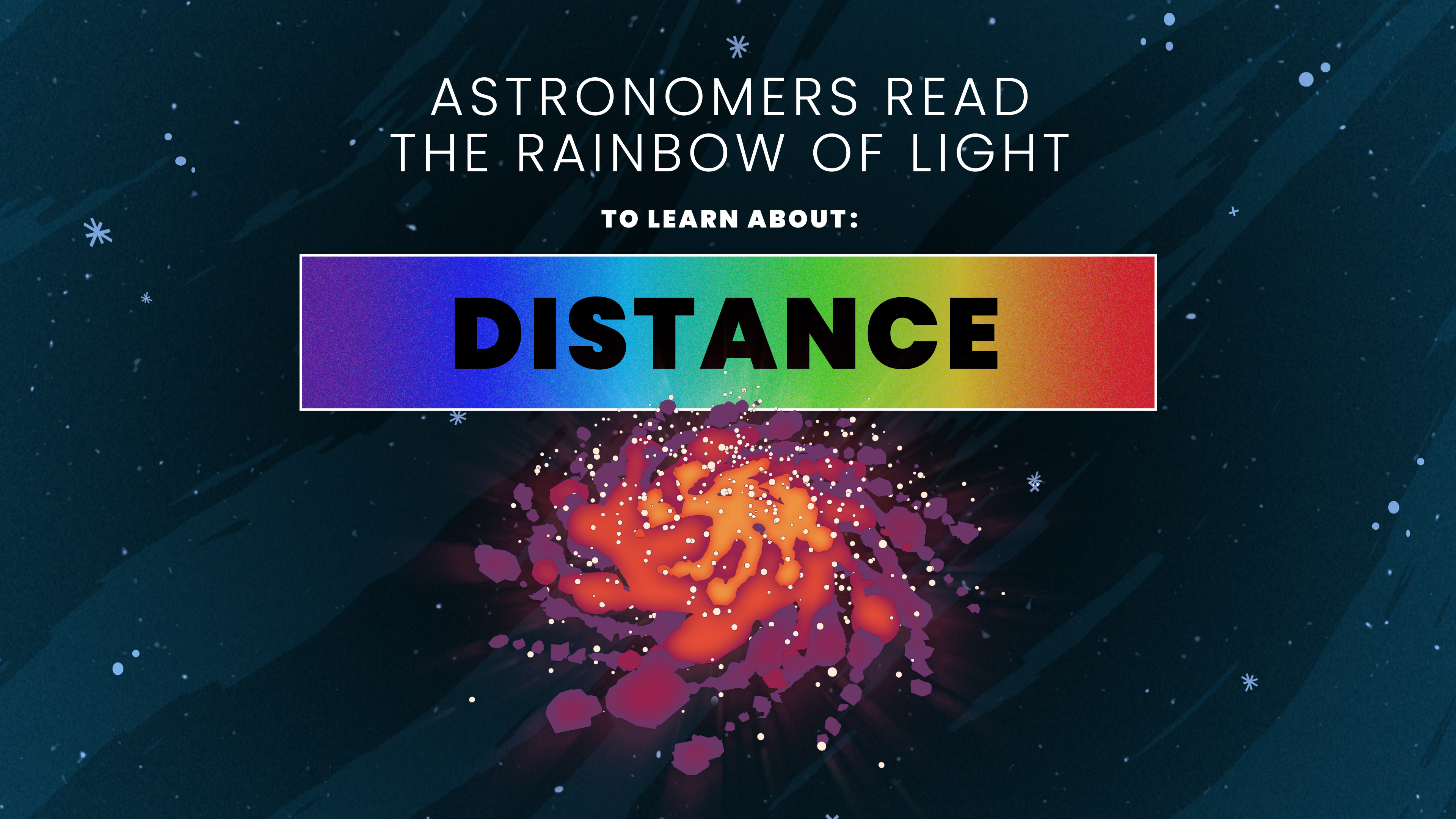 How do astronomers learn about something in space that is very far away? In addition to images, they study the light from cosmic objects like planets, stars, and galaxies. Astronomers spread light out to look at the detailed rainbow spectrum (plural: spectra). Light carries a lot of information, if you learn to “read” its rainbow! In this video, discover how astronomers read spectra to measure the vast distances of space.