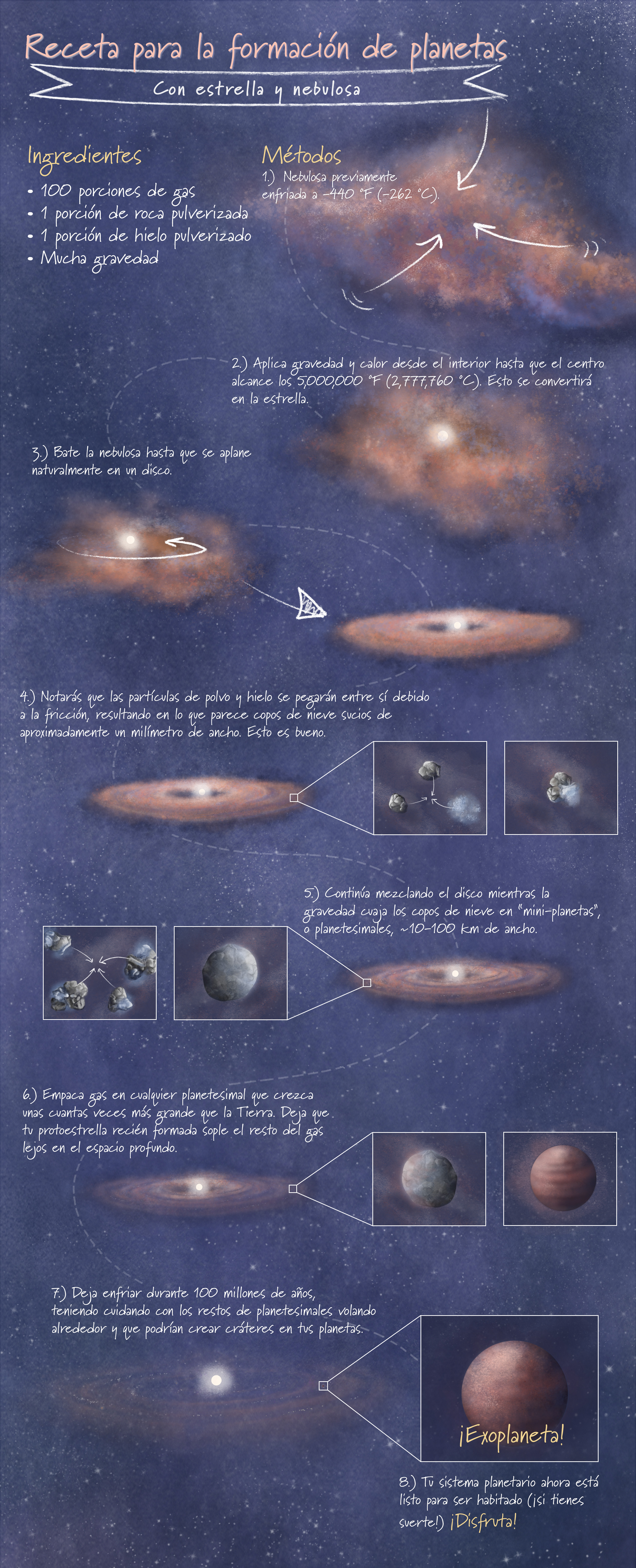 Esta infografía es una representación artística simplificada de la formación de planetas. Sigue el formato de una receta para hornear.