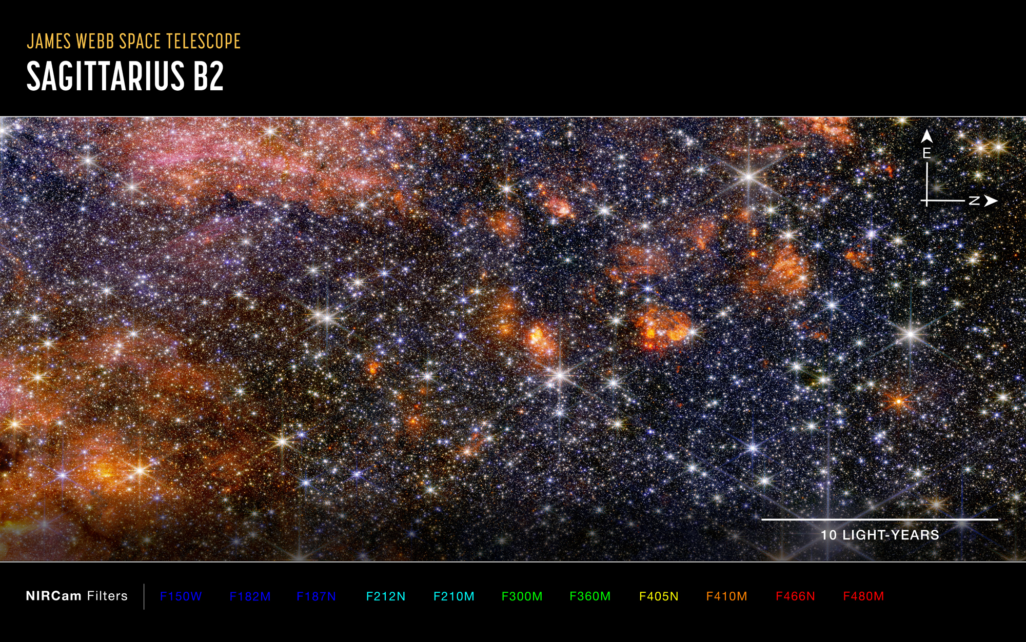 Stars, gas and cosmic dust in the Sagittarius B2 molecular cloud glow in near-infrared light, captured by Webb’s NIRCam (Near-Infrared Camera). In this light, astronomers see more of the region’s diverse, colorful stars, but less of its gas and dust structure. Webb’s instruments each provide astronomers with important information that help build a more complete picture of what is happening in this intriguing portion of the center of our galaxy.