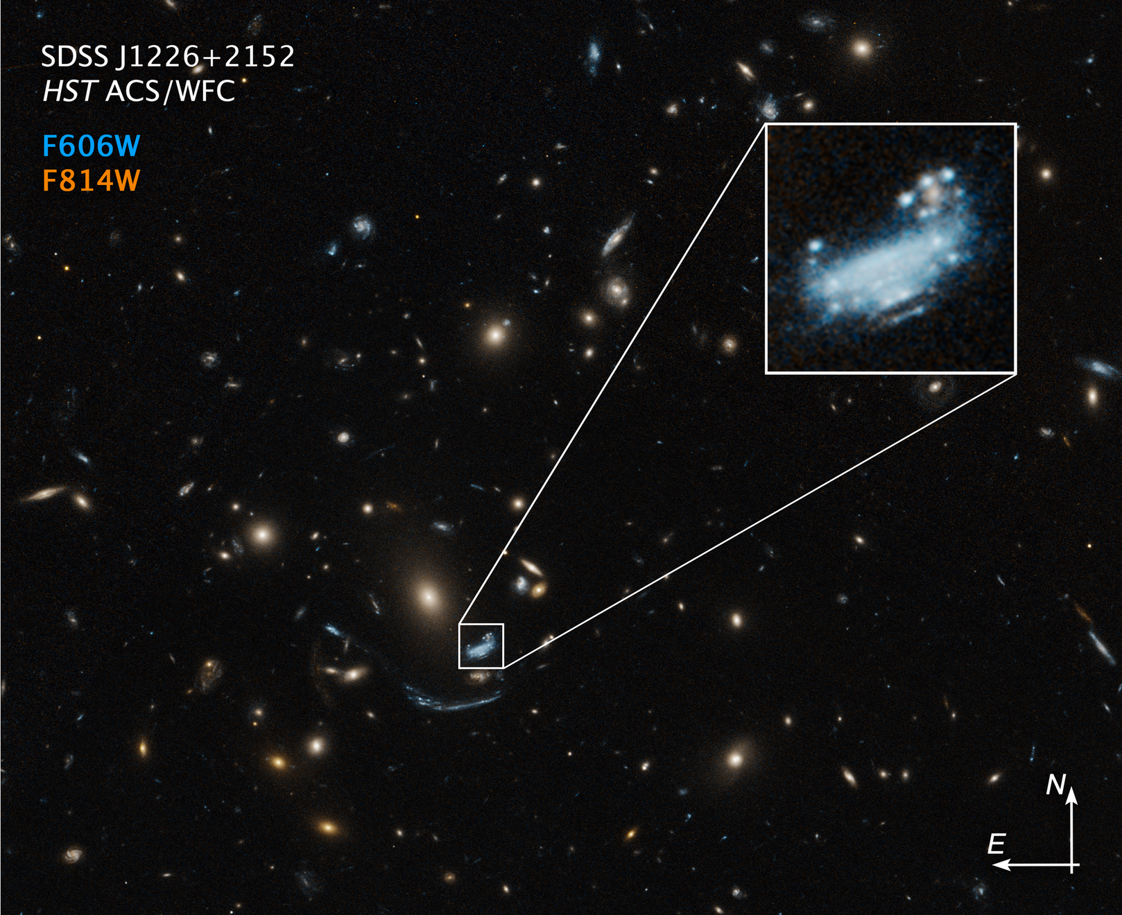 This image of galaxy SDSS J1226+2152, which lies toward the center of the image and is enlarged at top right, was captured by the Hubble Space Telescope’s Advanced Camera for Surveys and shows compass arrows and labels for reference. The north and east compass arrows show the...