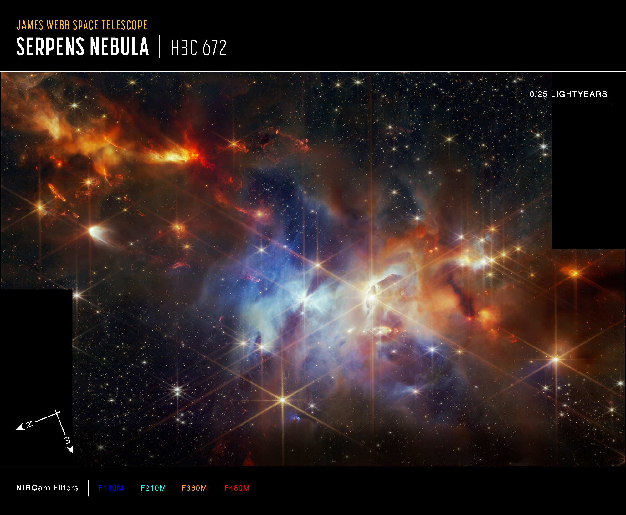 This image of the Serpens Nebula, captured by Webb’s Near-Infrared Camera (NIRCam), shows compass arrows, scale bar, and color key for reference. The north and east compass arrows show the orientation of the image on the sky. Note that the relationship between north and east on...