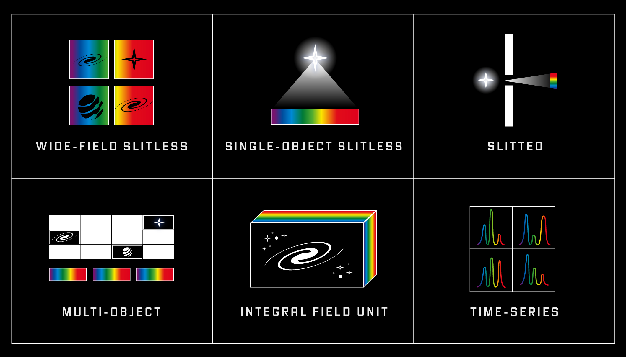 A grid of 6 squares, each with labeled icon. Top left: wide-field slitless. Top middle: single-object slitless. Top right: slitted. Bottom left: multi-object. Bottom middle: integral field unit. Bottom right: time-series.