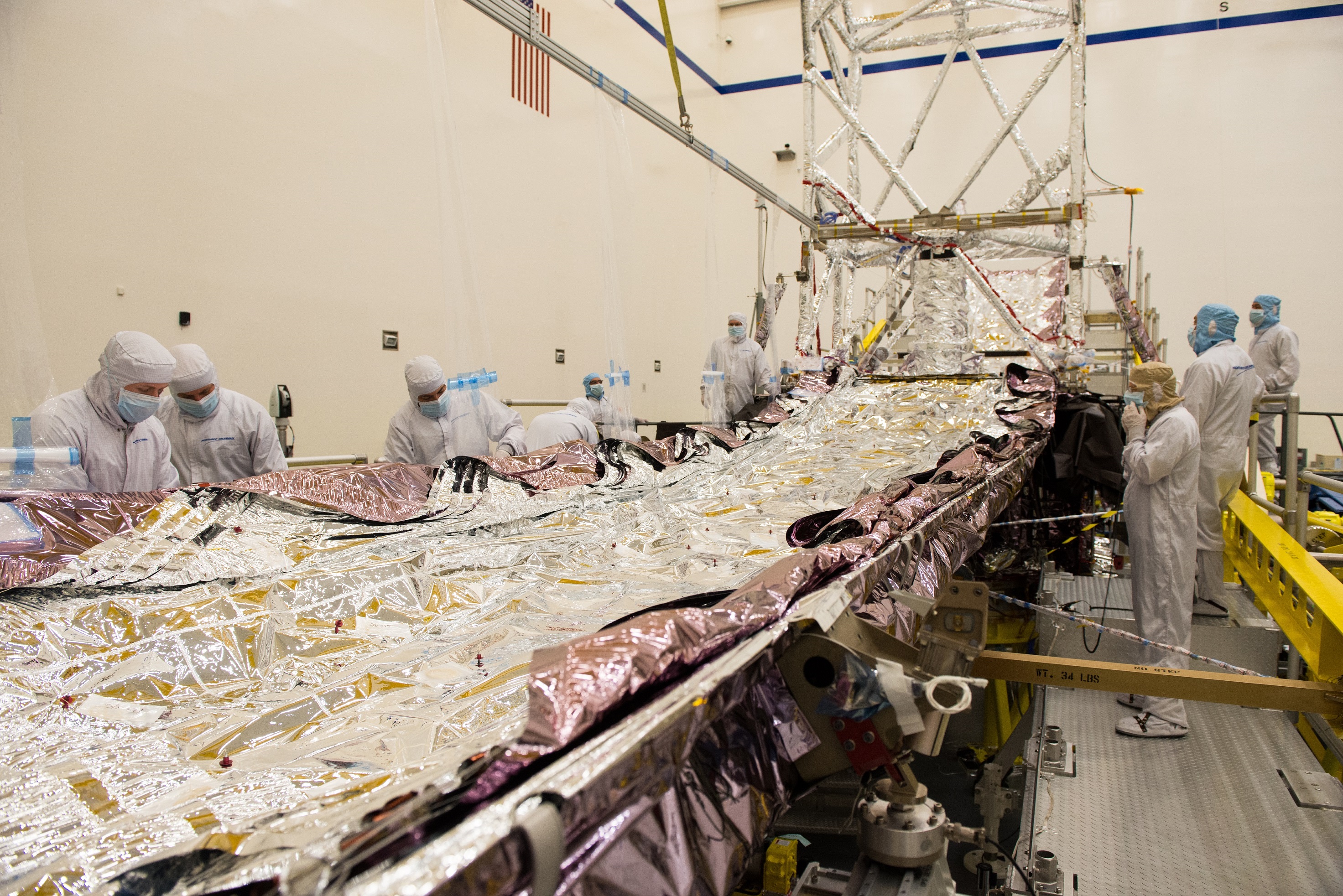 Technicians and engineers manually lower Webb’s folded sunshield layers for easier access and inspection. After being lowered, engineers thoroughly inspect all five layers of the reflective silver-colored sunshield for any issues that may have occurred as a result of acoustic testing in June, 2018. Acoustic testing exposes the spacecraft to similar forces and stress experienced during liftoff, allowing engineers to better prepare it for the rigors of spaceflight.
