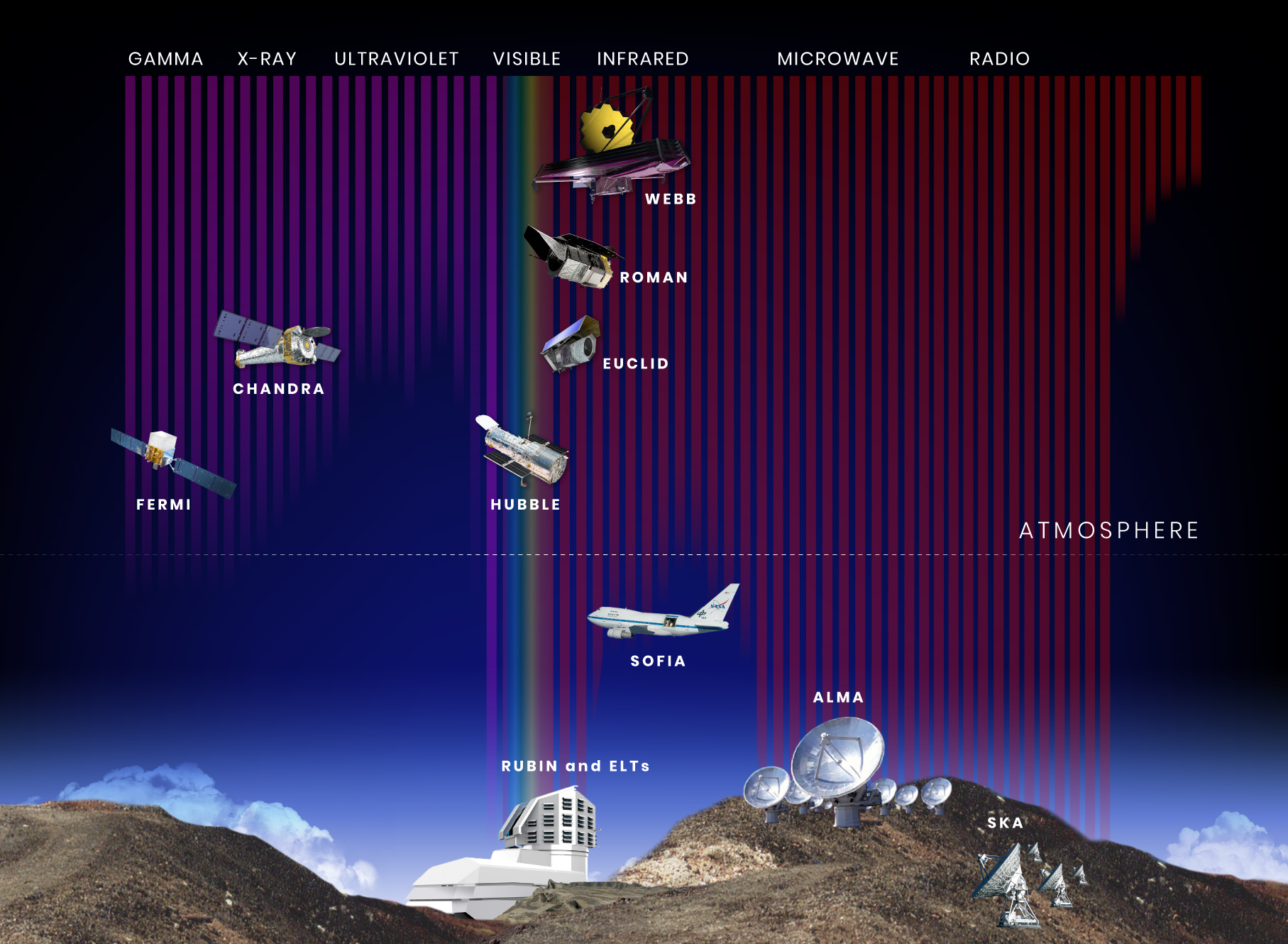 Mountains, clouds, sky, and space, with telescopes arranged vertically by altitude and horizontally by wavelength range
