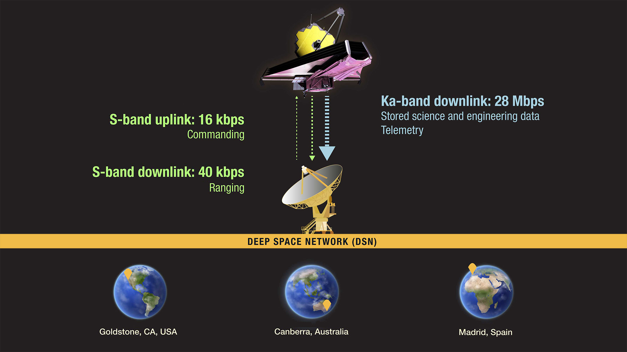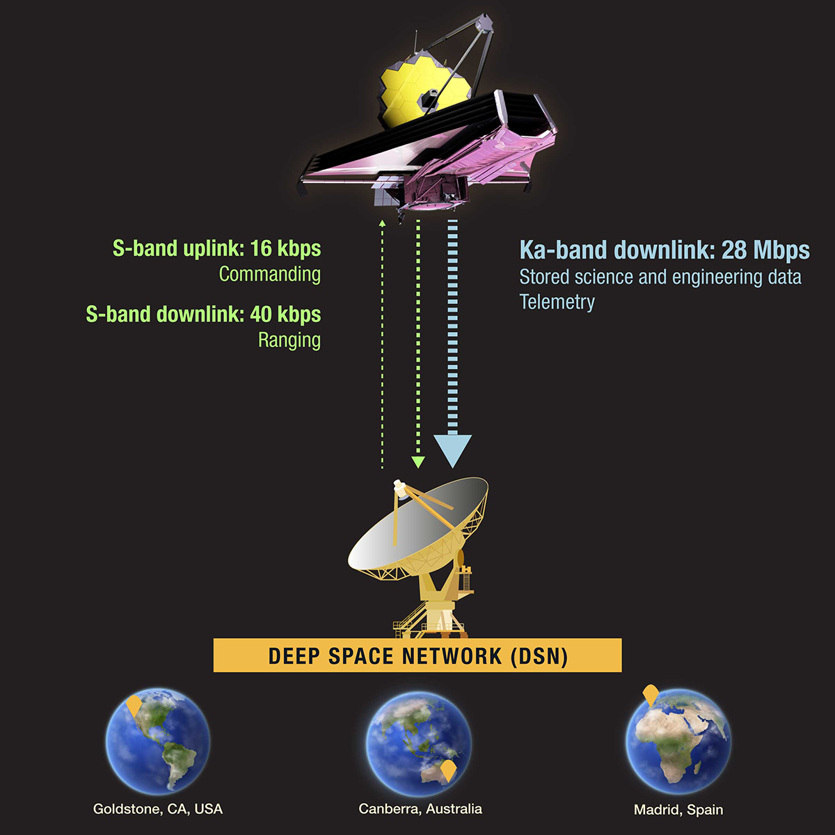 Members of the James Webb Space Telescope mission team communicate with the telescope, and download the data it has captured, via the Deep Space Network (DSN). The DSN consists of antenna arrays that are strategically located around the Earth so that contact is possible at any time of the day or night.
