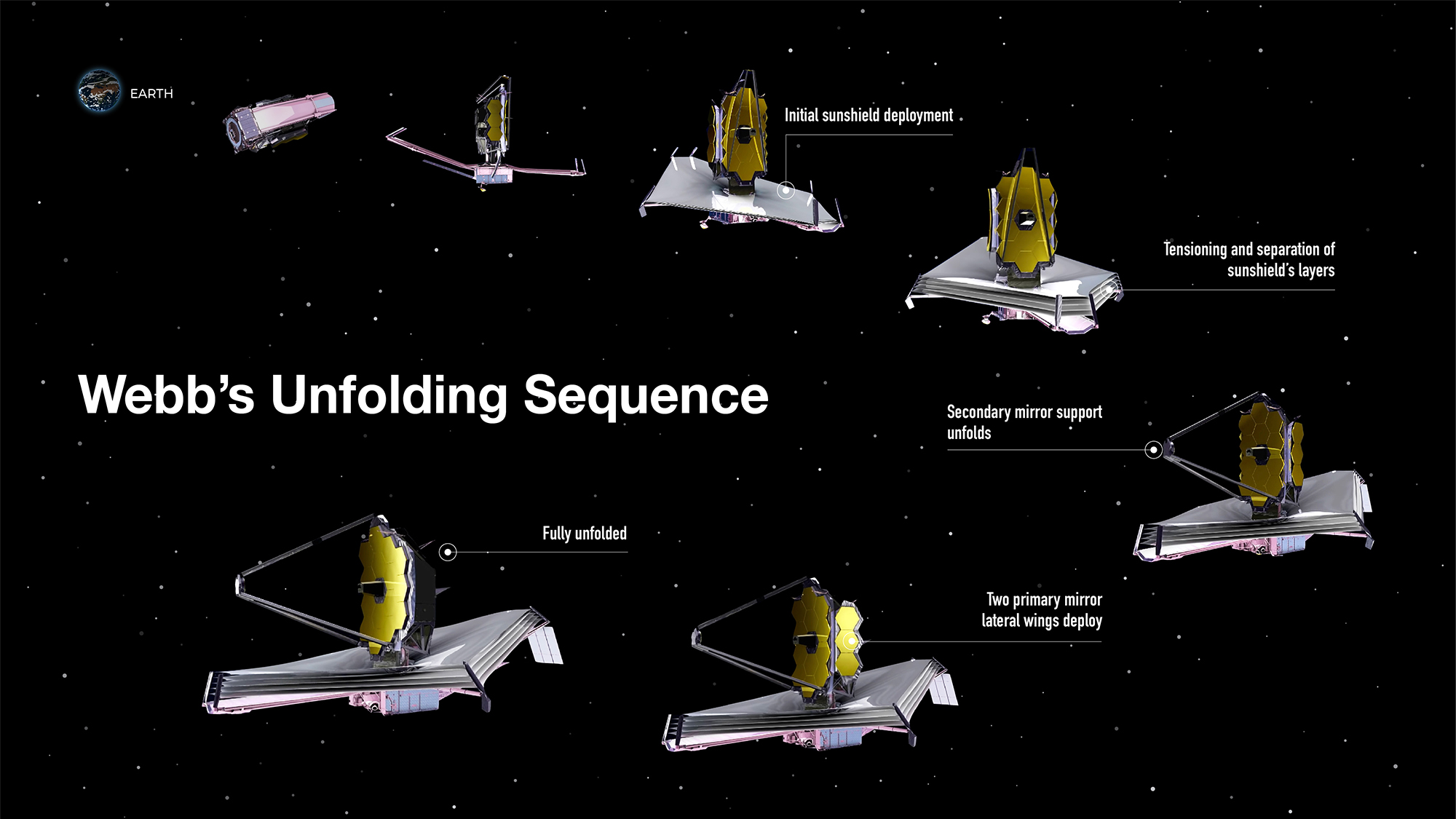 After launch and during the first month in space, on its way to the second Langrange point (L2), Webb undergoes a complex unfolding sequence.