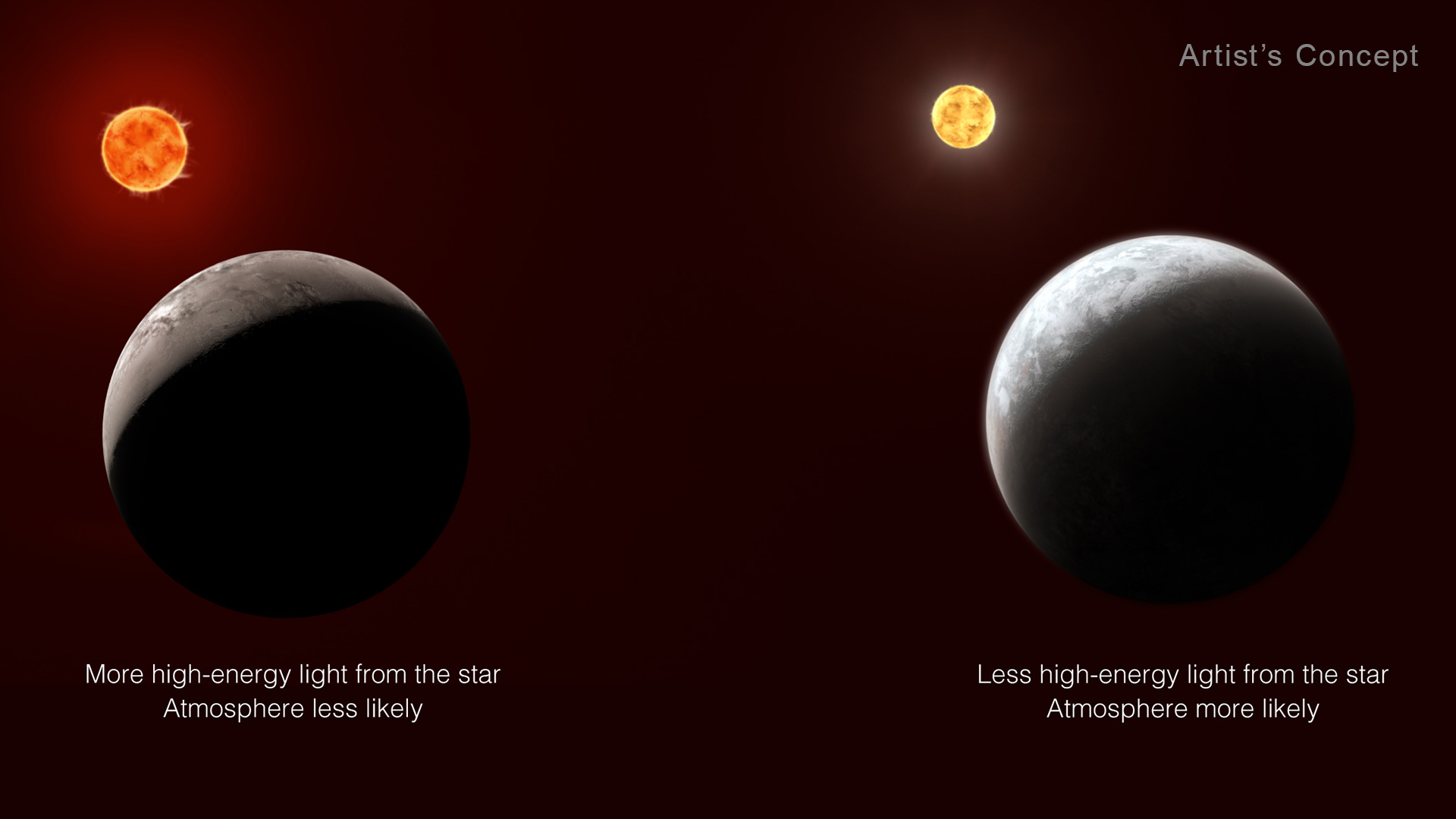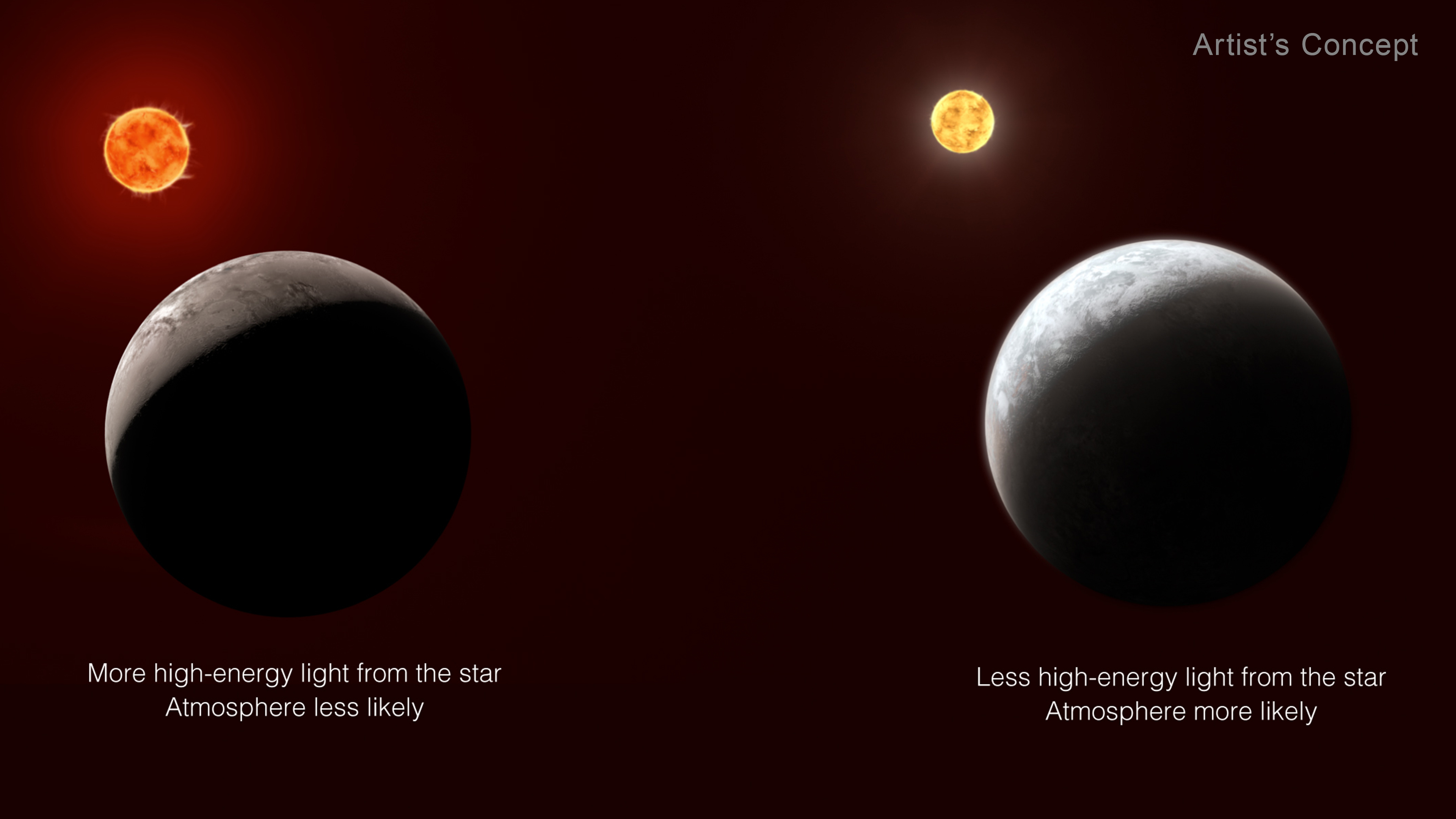 All other things being equal, the more high-energy light a planet receives from its star, the less likely it is to have an atmosphere. When starlight — particularly X-rays and ultraviolet light — reaches a planet, gas molecules in the atmosphere heat up and move very fast. If they absorb enough energy to move faster than the escape velocity of the planet, they can fly off into space. The more energy the planet receives from its star over time, the harder it is for the planet to hold on to its atmosphere. This is one reason why Mercury has only a trace atmosphere.