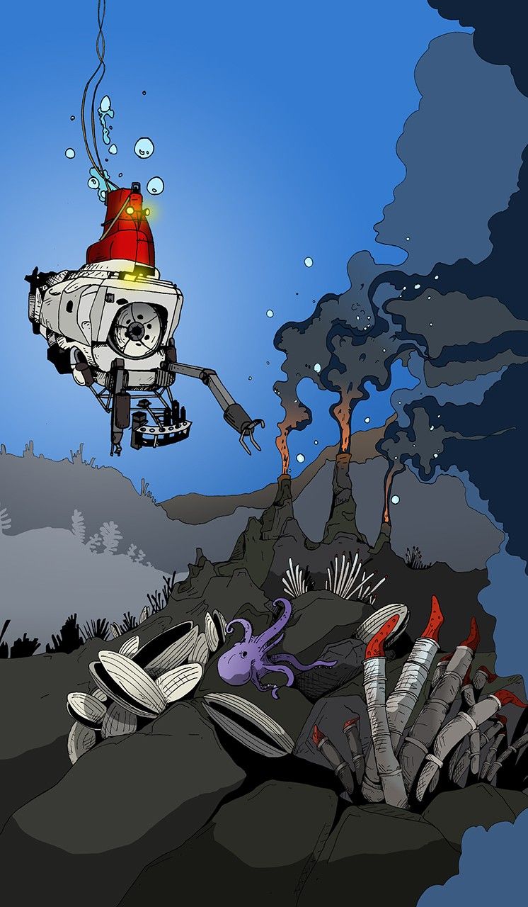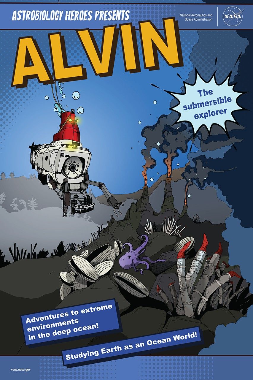 Alvin is a crewed deep-ocean research submersible that in 1977, was used to explore the ocean floor near the Galapagos Islands and identified hydrothermal vents at the bottom of the sea for the first time. The finding showed us that deep ocean environments could be habitats for life on worlds far from the energy of the Sun. Suddenly, subsurface oceans on icy worlds in the outer Solar System became a focus of astrobiology research. Icy moons like Jupiter’s moon Europa and Saturn’s moon Enceladus are now prime targets for astrobiology exploration. To read more about Alvin, check out Issue 4 of the Astrobiology Graphic Histories.