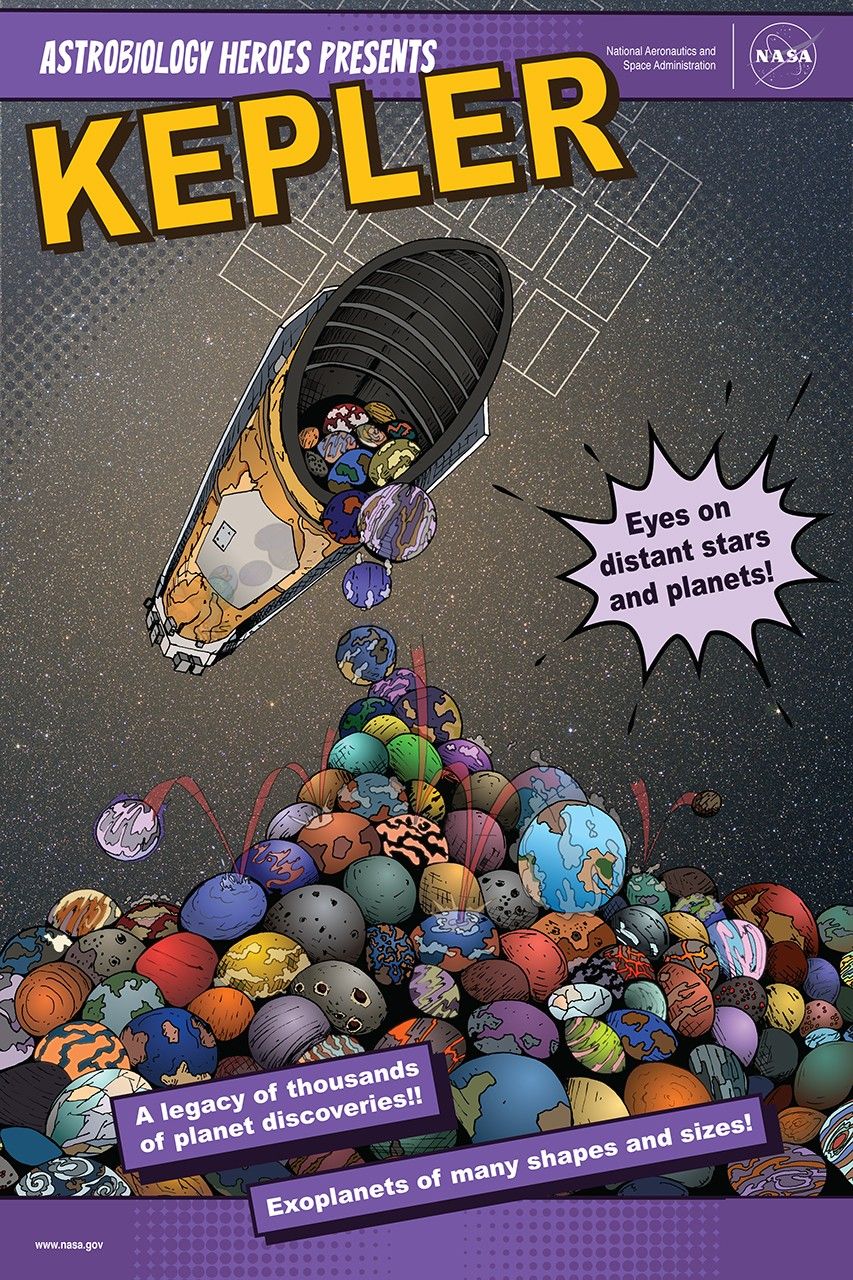 NASA’s powerful Kepler space observatory was designed to survey a specific portion of our region of the Milky Way galaxy. An important part of Kepler’s work was the identification of Earth-size planets around distant stars. Kepler left a legacy of more than 2,600 exoplanet discoveries, paving the way for future scientific efforts and the search for life beyond the Solar System. To read more about Kepler, check out Issue 6 of the Astrobiology Graphic Histories.