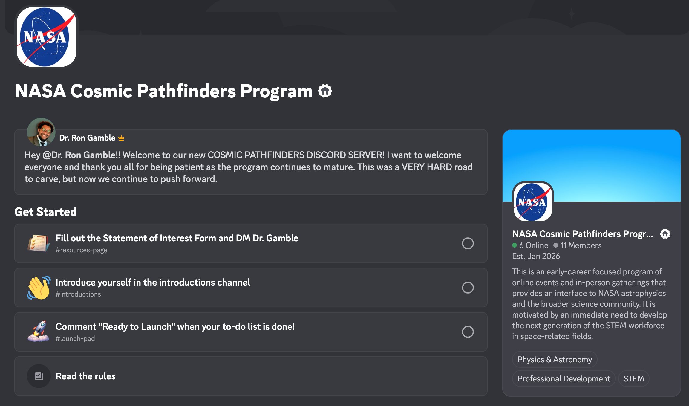 What does this mean? It means the new space will have broader access to more resources and people while retaining the primary objectives of the program but with a much more streamlined flow. This includes the same access to your peers, but with added features like a co-working “study hall channel”, automated updates from all (18) of our science interest groups across COPAG/PHYSPAG/EXOPAG, and even an Astronomy Picture of the Day channel. Additionally, the new space is setup so that you won’t have to keep track of your favorite science interest group pages. They all have individual channels that are automatically updated whenever a new event is posted!