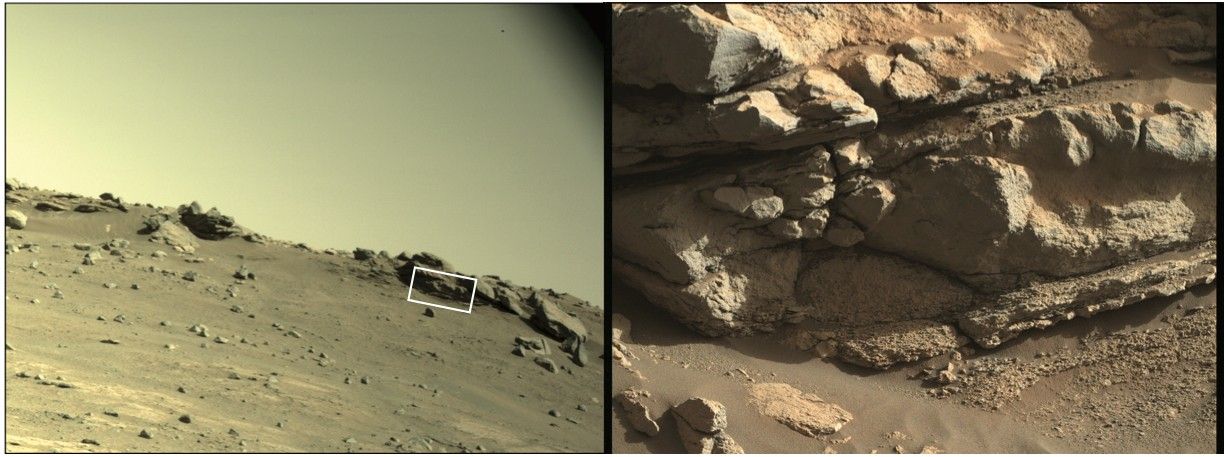 Perseverance has now driven several hundred meters further, scouting out “Artuby” ridge, which contains a number of outcrops showing different styles of layering. This reconnaissance is useful, as the rover is likely to eventually come back this way after checking out some more terrain up ahead and carrying out another sampling campaign.