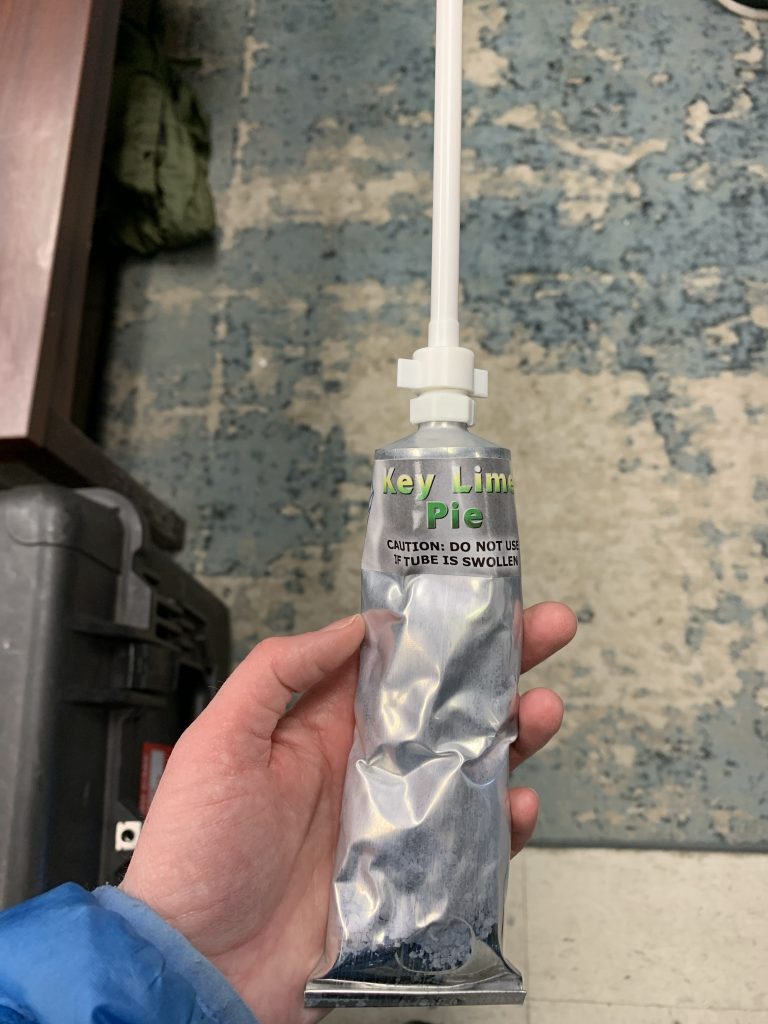“See this small hole at the bottom of the helmet? We have a whole selection of food that we can give the pilots and they drink it through a straw that goes into that hole. They can have applesauce, beef stew, key lime pie, peaches, chocolate pudding, you name it!” Joey was excited to share the menu with me and I couldn’t help thinking that the key lime pie sounded pretty good. And after actually trying it, I can confirm it does taste exactly like key lime pie, just put through a blender.