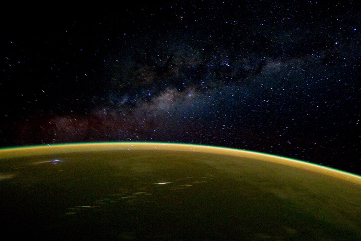 While poking around the Gateway to Astronaut Photography of Earth (tens of thousands of photos of Earth from space, dating back to the Mercury program) I found this photo of the Milky Way rising (setting?) above the Earth’s limb: